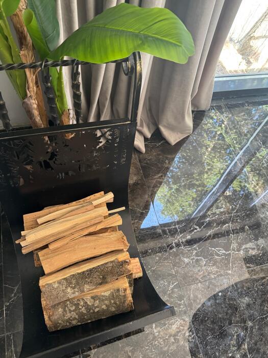 Справа находится дровница, а также набор для камина.