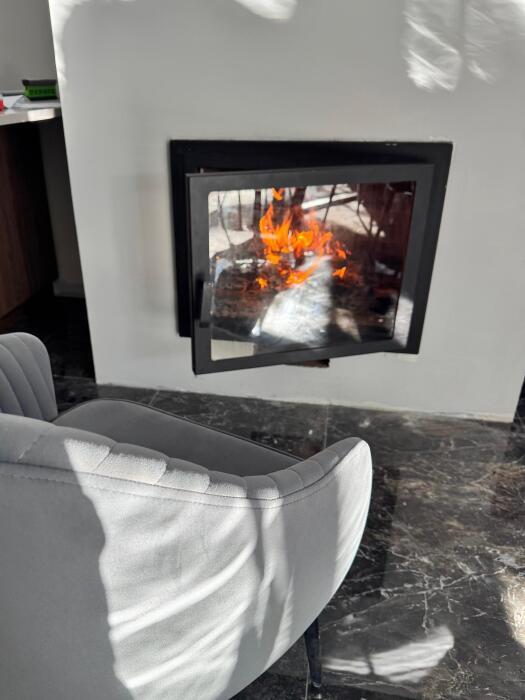Наши гости могут насладиться живым камином, встроенным в нишу под телевизором. В камине расположены 3 вывода для теплоотдачи.
