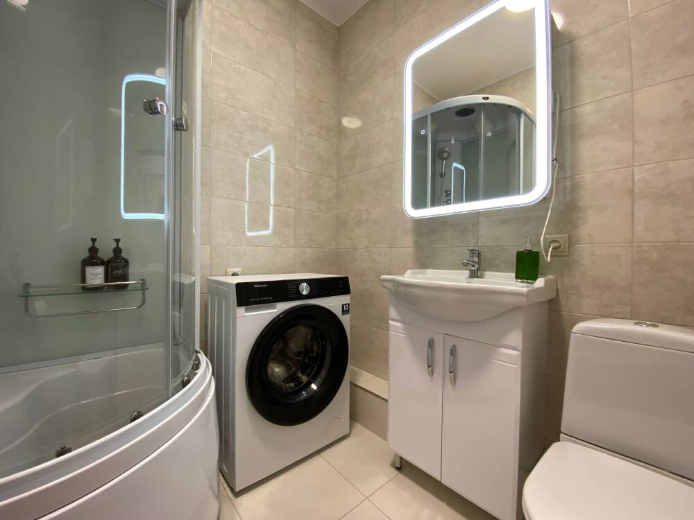 - Ванная комната с гелем для душа, шампунем, зубной пастой.