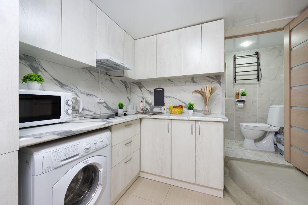 Телевизор, холодильник, стиральная машина и микроволновая печь.
