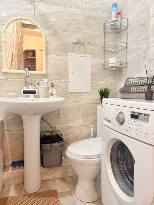 Двухспальная кровать, диван-кровать, телевизор, кондиционер, стиральная машина