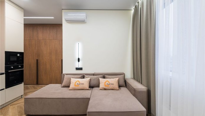 В апартаментах есть отдельная спальня с двуспальной кроватью, уютная гостиная с большим диваном и телевизором, а также полноценная кухня с варочной панелью, духовкой, микроволновкой и посудомоечной машиной. Современный санузел с душем, стиральная машина, фен и косметические наборы- всё для Вашего удобства.