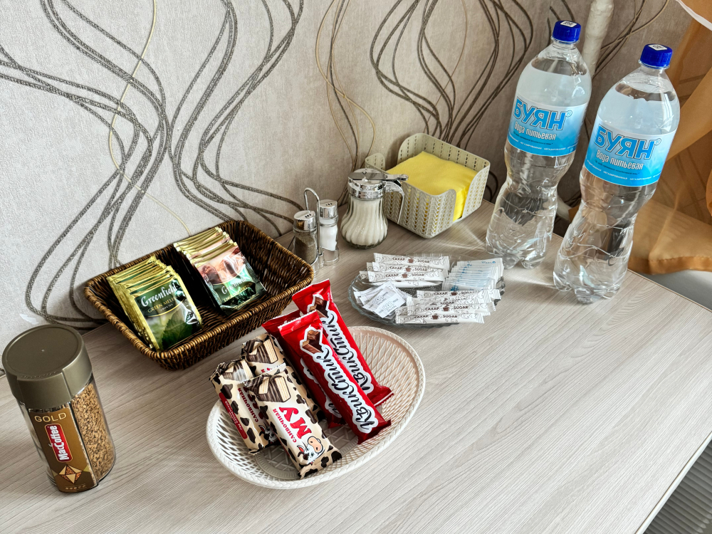 Дорогие гости, в квартире Вас ожидает набор продуктов первой необходимости – пакетированный чай, кофе, сахар, соль, перец в одноразовых стиках.