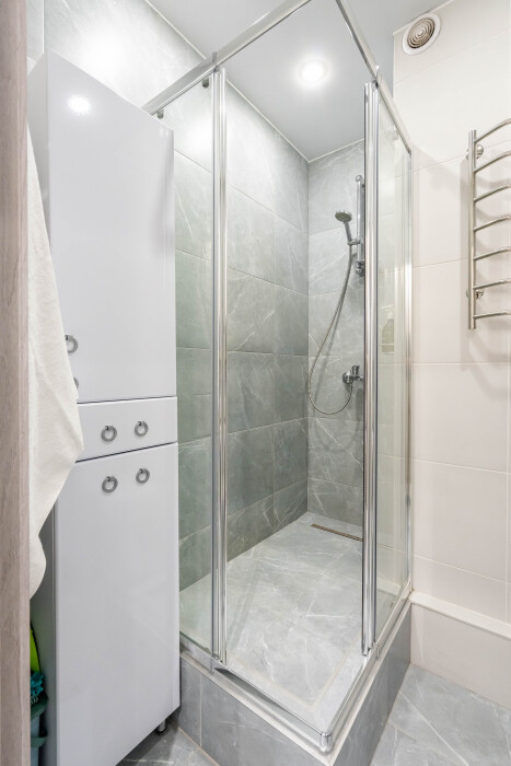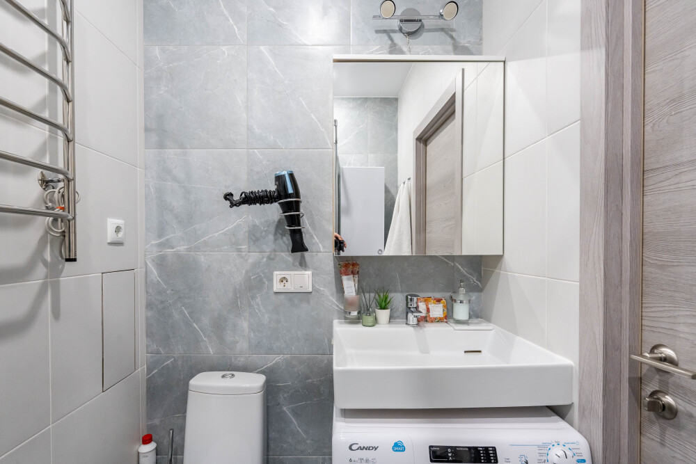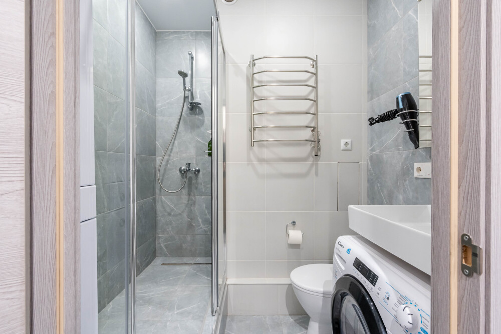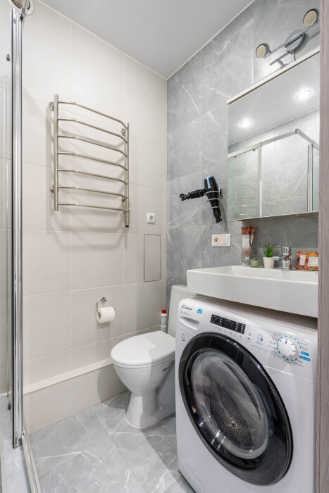 - утюг, гладильная доска, стиральная машина с сушкой, сушилка, фен, полноценная ванная комната с душевой кабиной и туалетом;