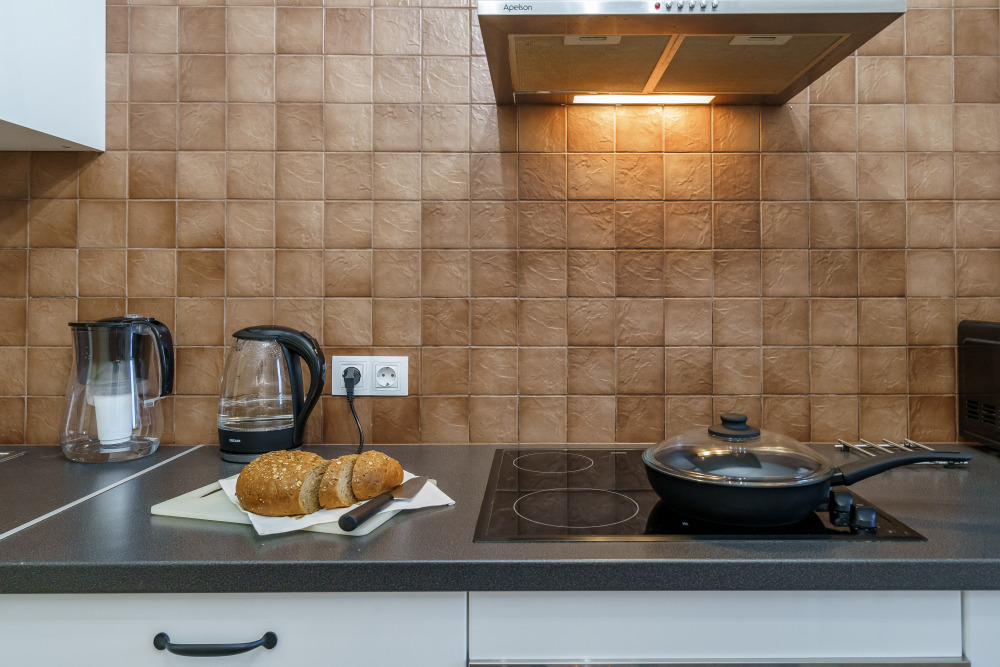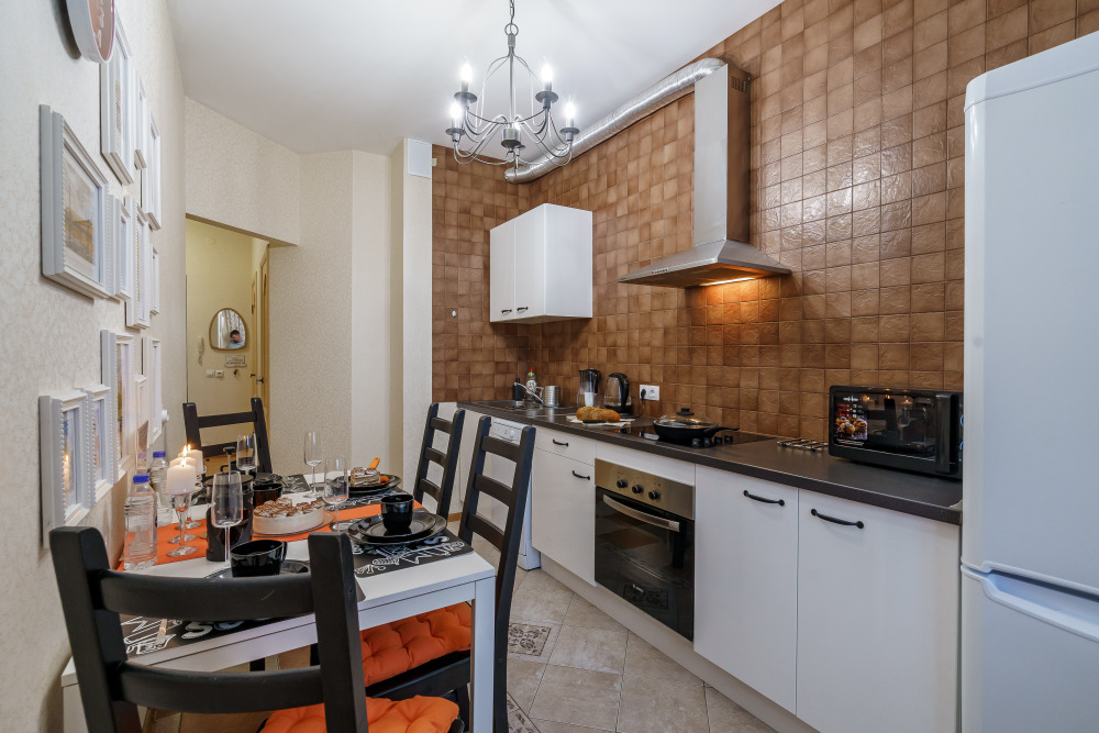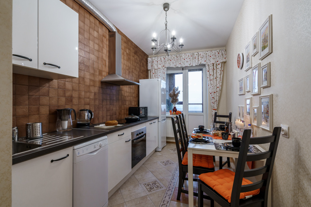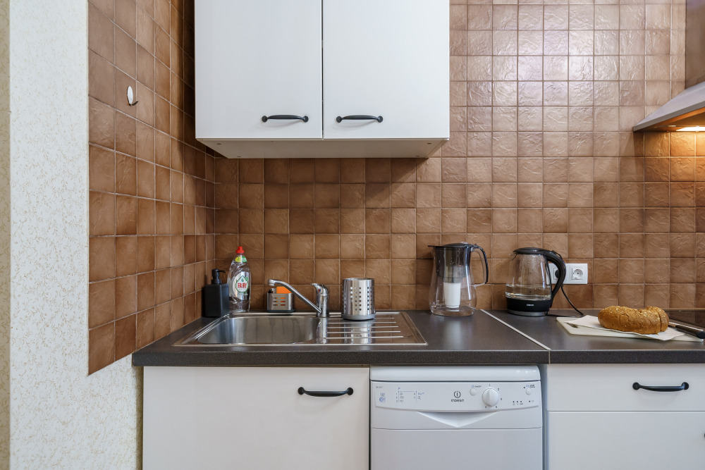 - полностью оборудованный кухонный уголок со всей посудой, электроплита, микроволновка, посудомойка, духовка;