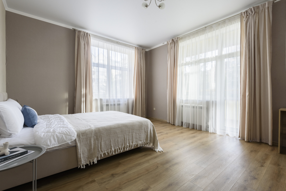 Удобную двуспальную кровать с ортопедическим матрасом, раскладной диван для двух дополнительных мест и одноместный диван.