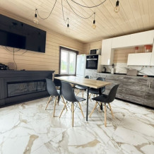 - 2 спальни с двуспальными кроватями, так же на втором этаже диван , спальное место 140 на 200. совмещённая кухня-студия (зал) с раскладным удобным диваном и обеденной зоной, санузел с душевой.