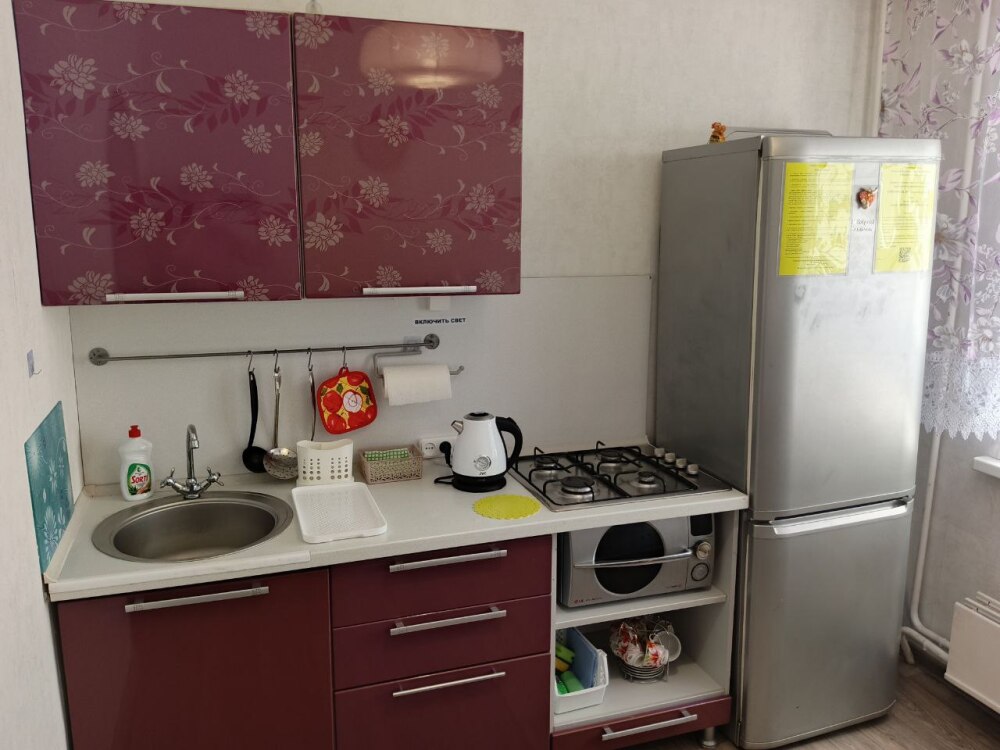 -️ на кухне - газовая плита, СВЧ печь, электрический чайник, холодильник, посуда, кастрюли, вилки-ложки и остальные принадлежности, а также прочие необходимые мелочи;