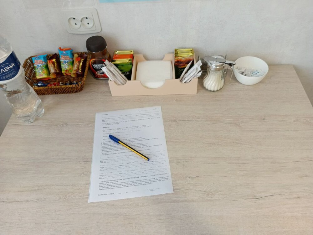 Дорогие гости, в квартире вас ожидает набор продуктов первой необходимости – сладости, пакетированный чай, кофе, сахар, соль, перец в одноразовых стиках.