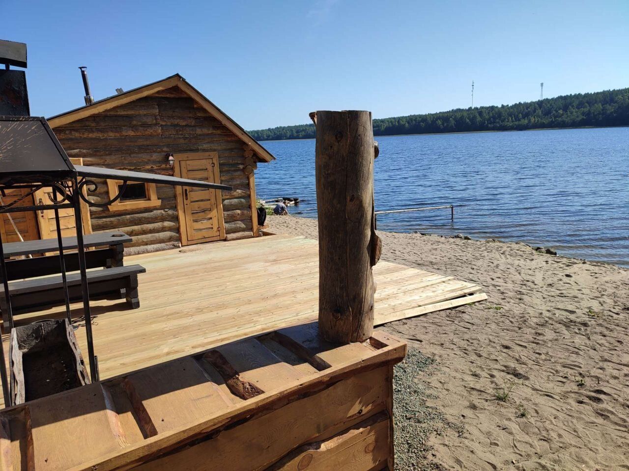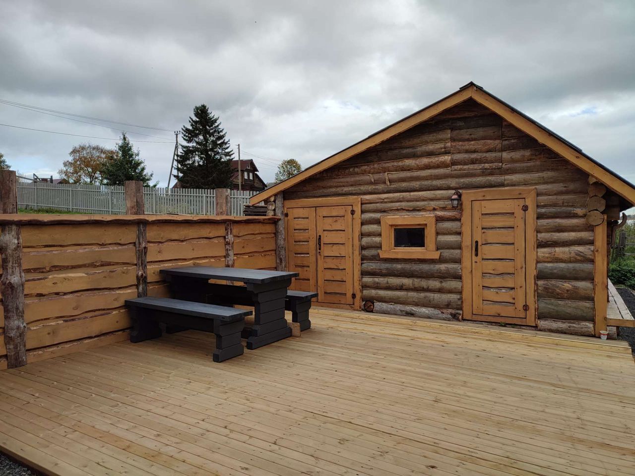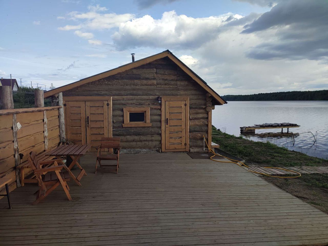 Стилизованная под старину баня на берегу с примыкающей к ней открытой террасой с уличной мебелью.