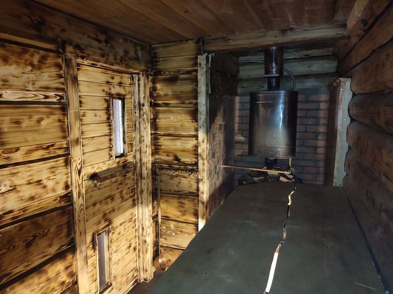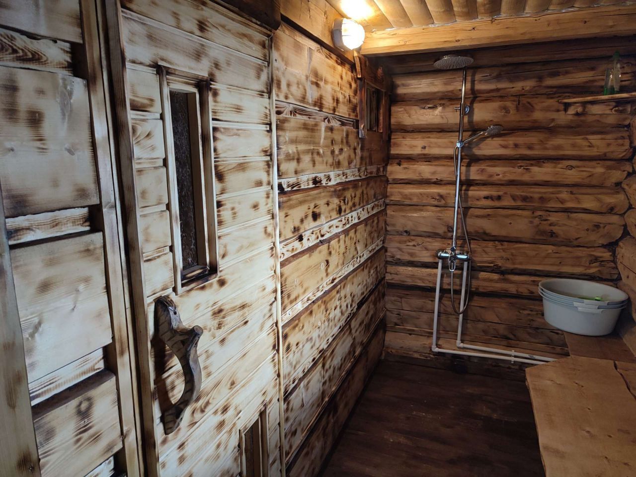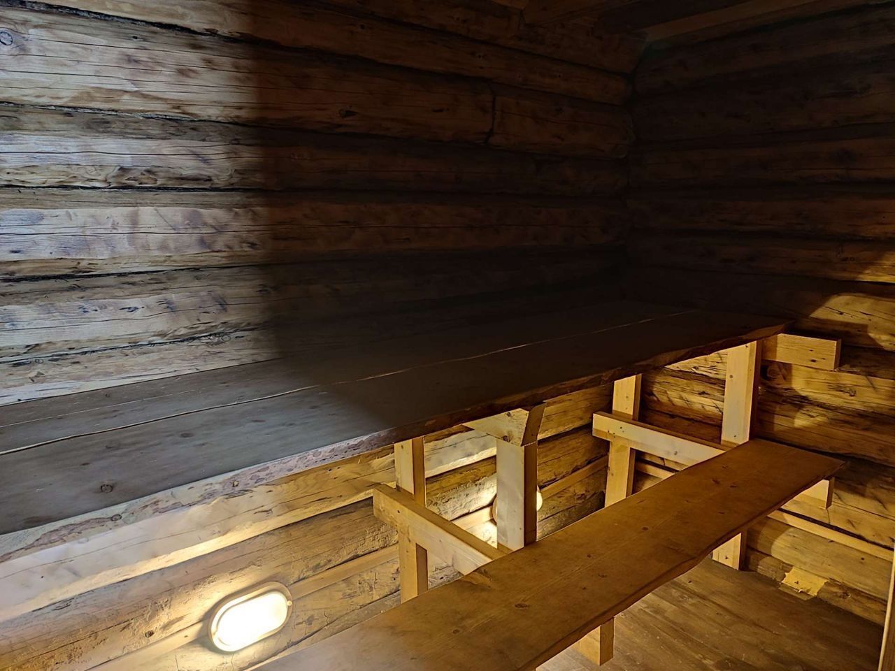 Стилизованная под старину баня на берегу с примыкающей к ней открытой террасой с уличной мебелью.