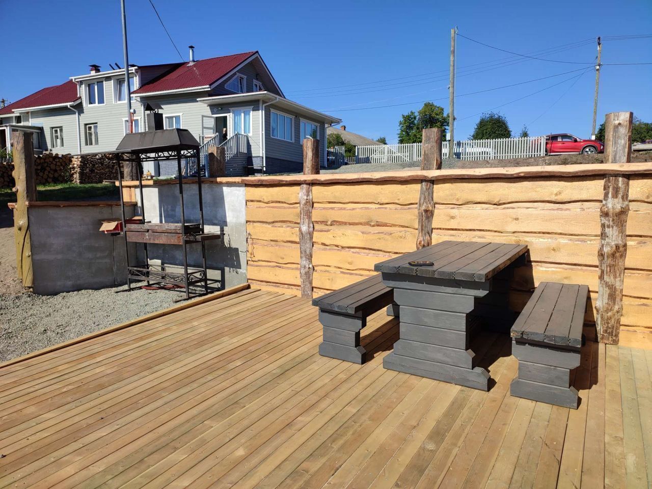 Беседка под крышей с зоной барбекю и коптильней во дворе.