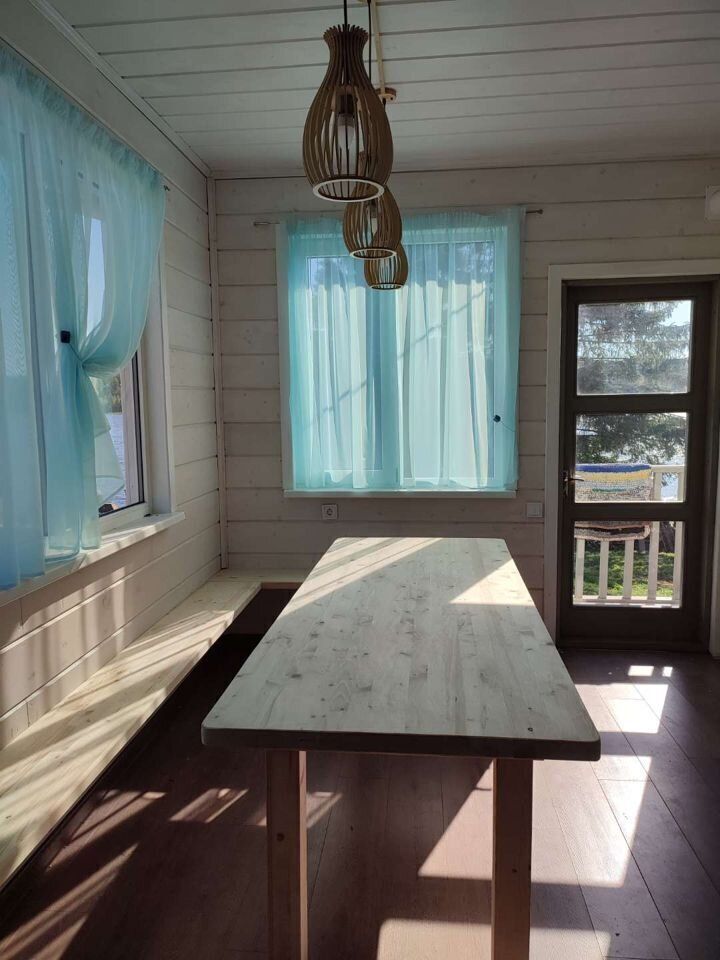 Большая закрытая веранда со столом и скамейками.