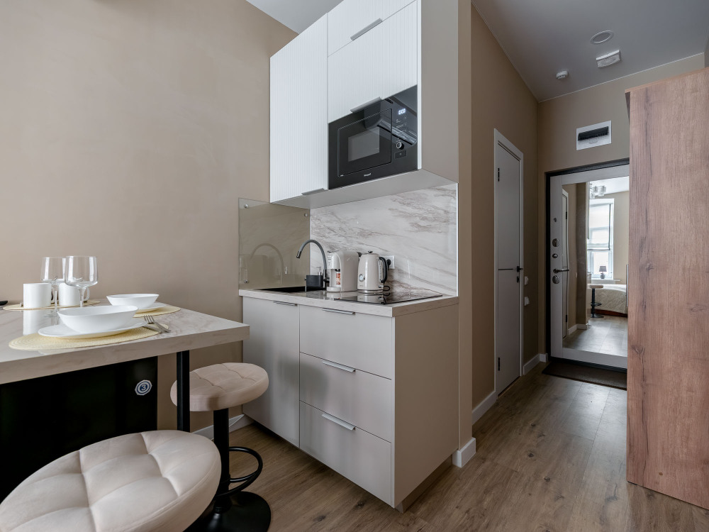 Полностью оборудованная кухня: варочная панель, СВЧ, чайник, мини-холодильник, посуда, столовые приборы.