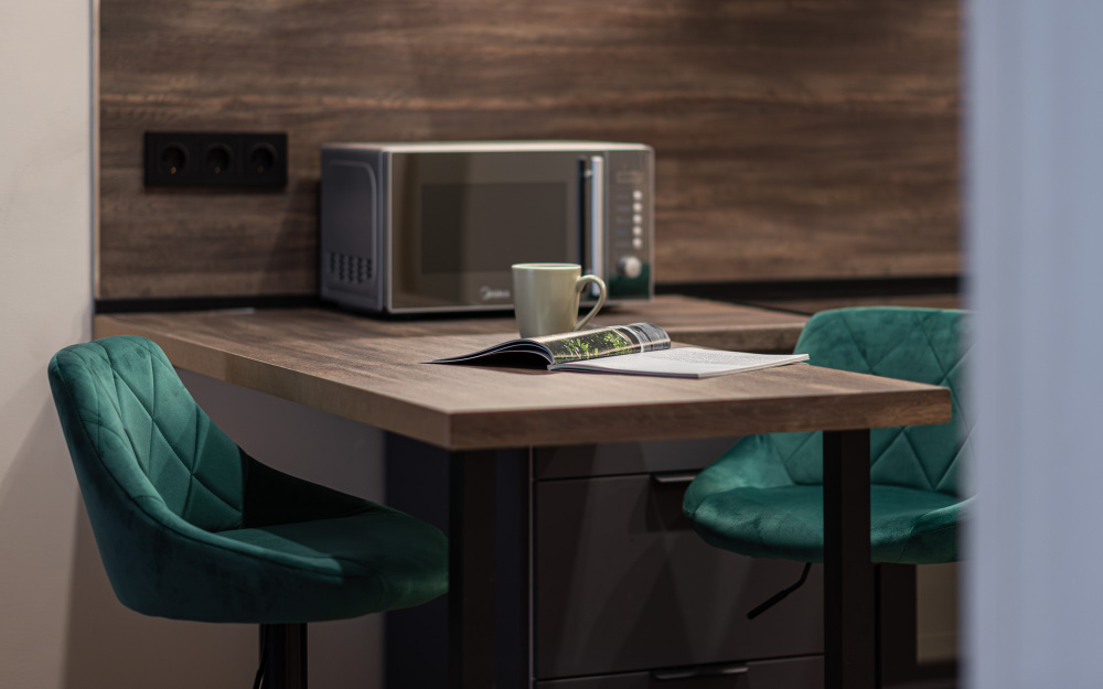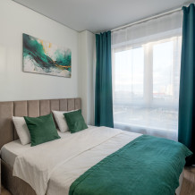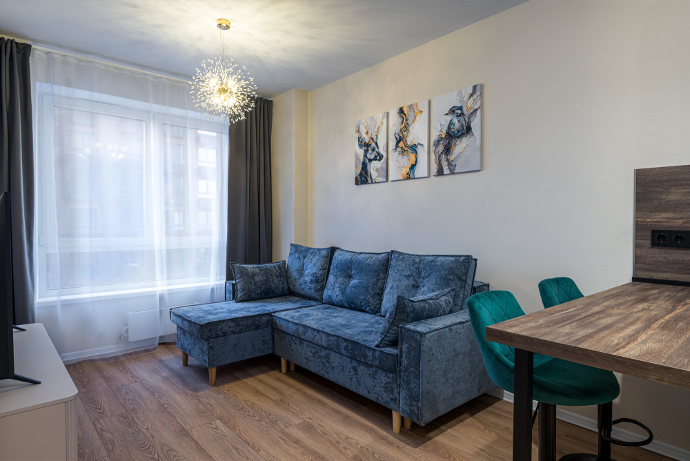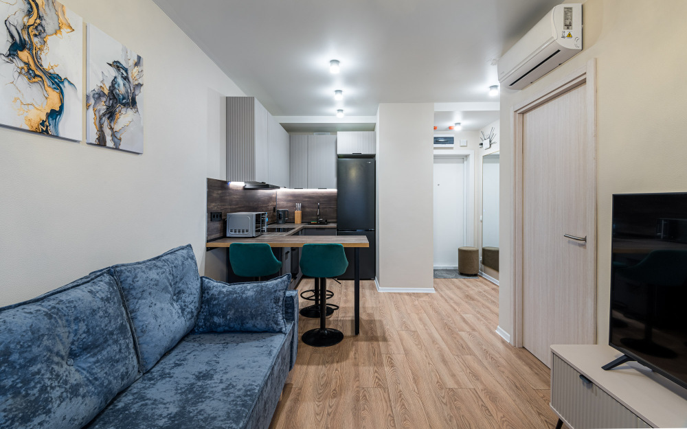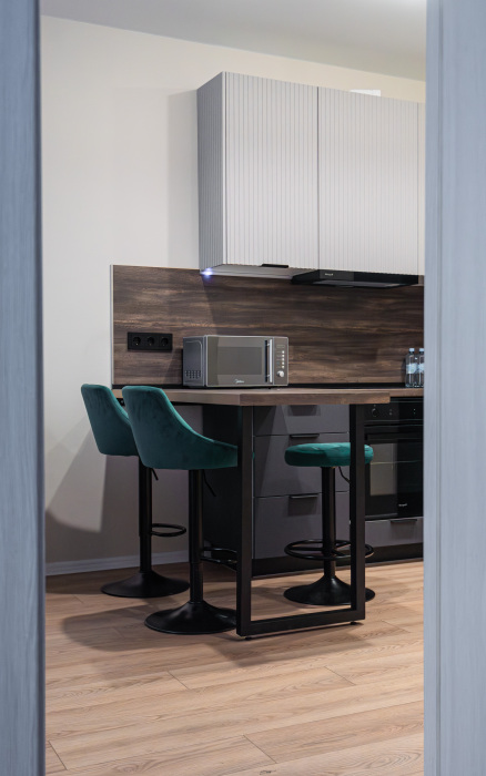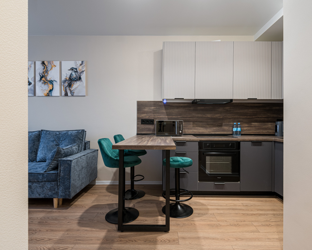 Апартаменты площадью около 38 м² продуманы для удобного размещения семьи или небольшой компании. В спальне — большая двуспальная кровать размера king size с качественным матрасом и подъемным механизмом для хранения вещей, прикроватные тумбы и шкаф. В гостиной — раскладной диван с подушками, телевизор, пуфы и удобная барная зона с высокими стульями.