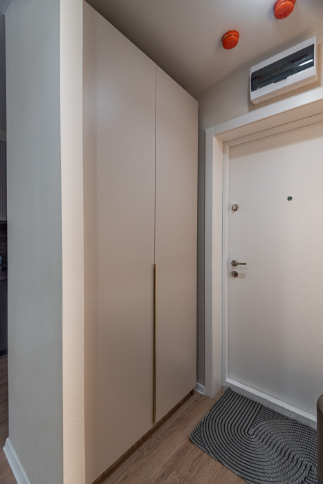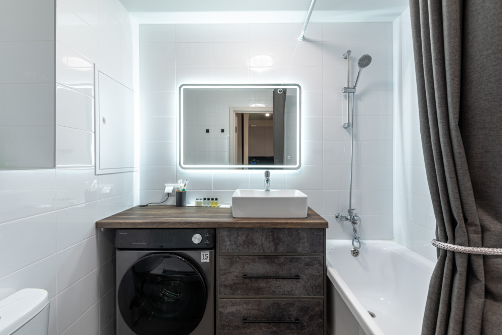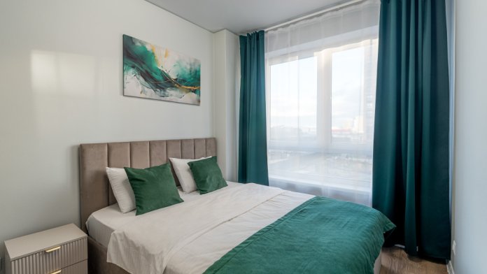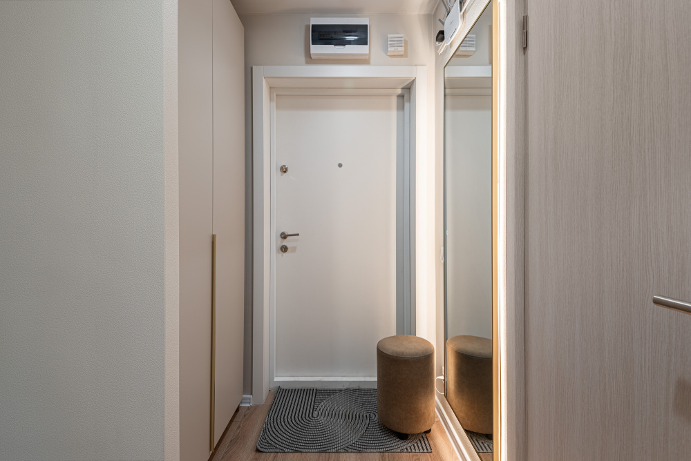 Интерьер апартаментов оформлен в светлых и спокойных тонах с элементами современного стиля и классики. В пространстве есть картины, зеркала с подсветкой и шторы блэкаут — всё для уюта и приватности.