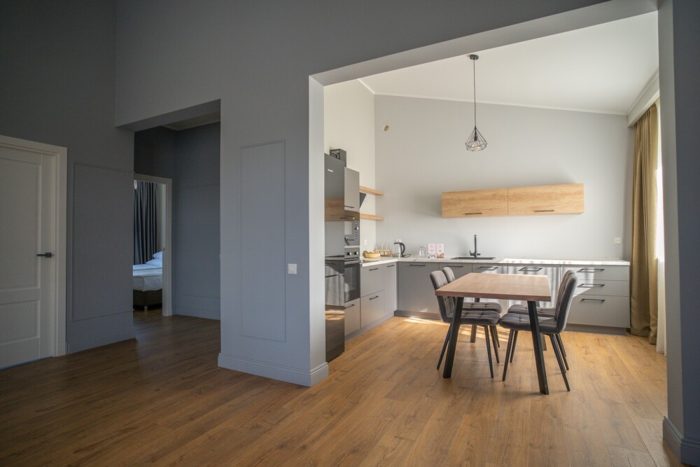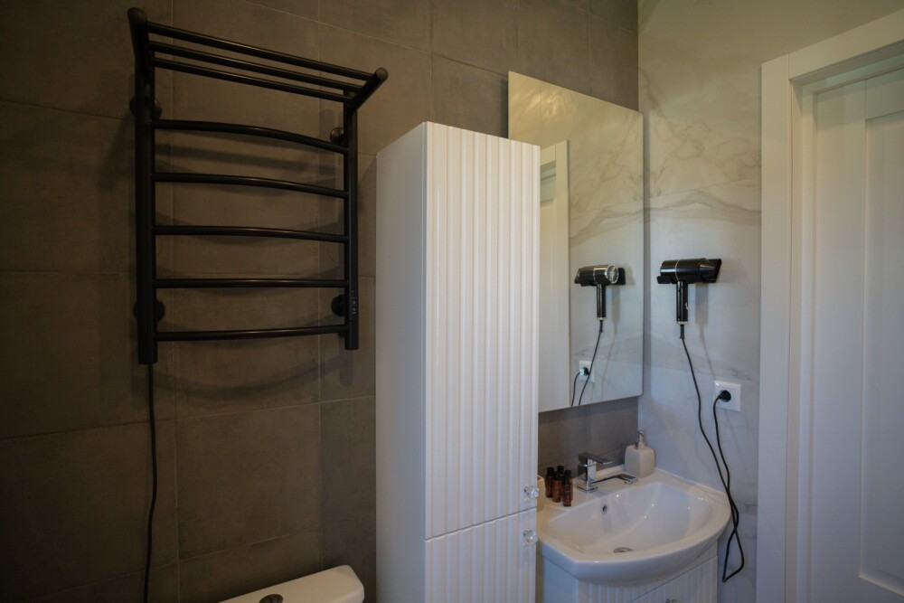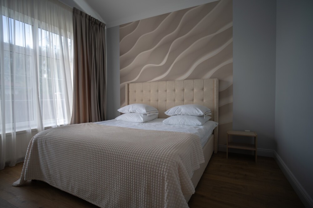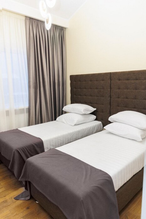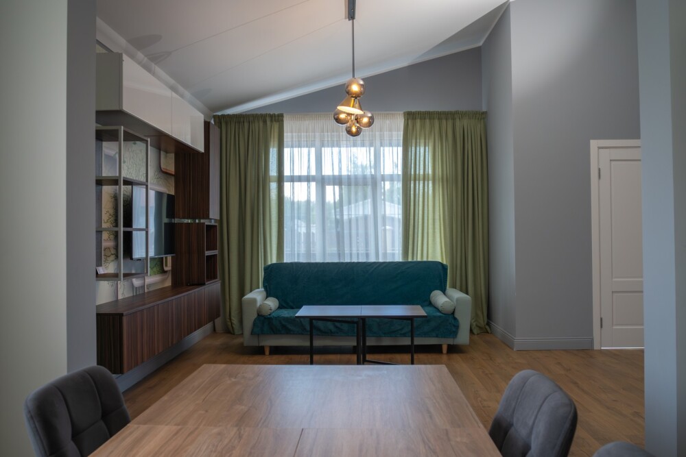 Коттедж с двумя изолированными спальнями (одна - с двуспальной, вторая - с двумя односпальными кроватями), постирочной комнатой с гардеробом, кухней со столовой зоной и гостиной. Комфортная вместимость - 4 человека (возможна организация двух дополнительных мест за отдельную плату).