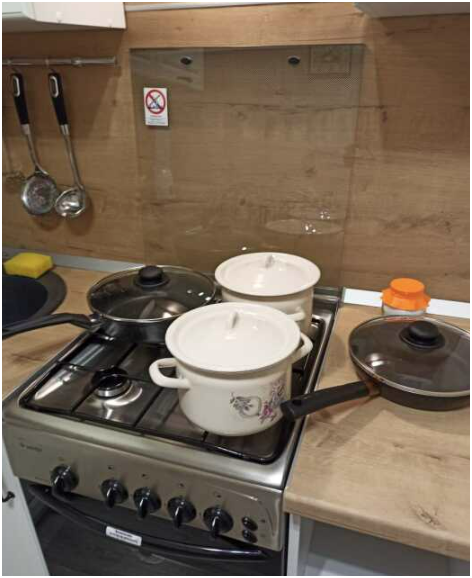 Кухня с необходимой посудой для приготовления, микроволновка, холодильник, электрический чайник.
