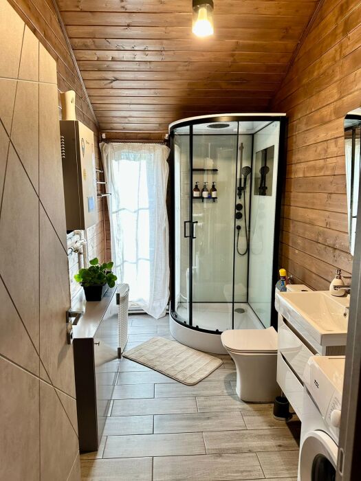 Чистота и удобство: стиральная машина, современный санузел с душевой кабиной, фен.