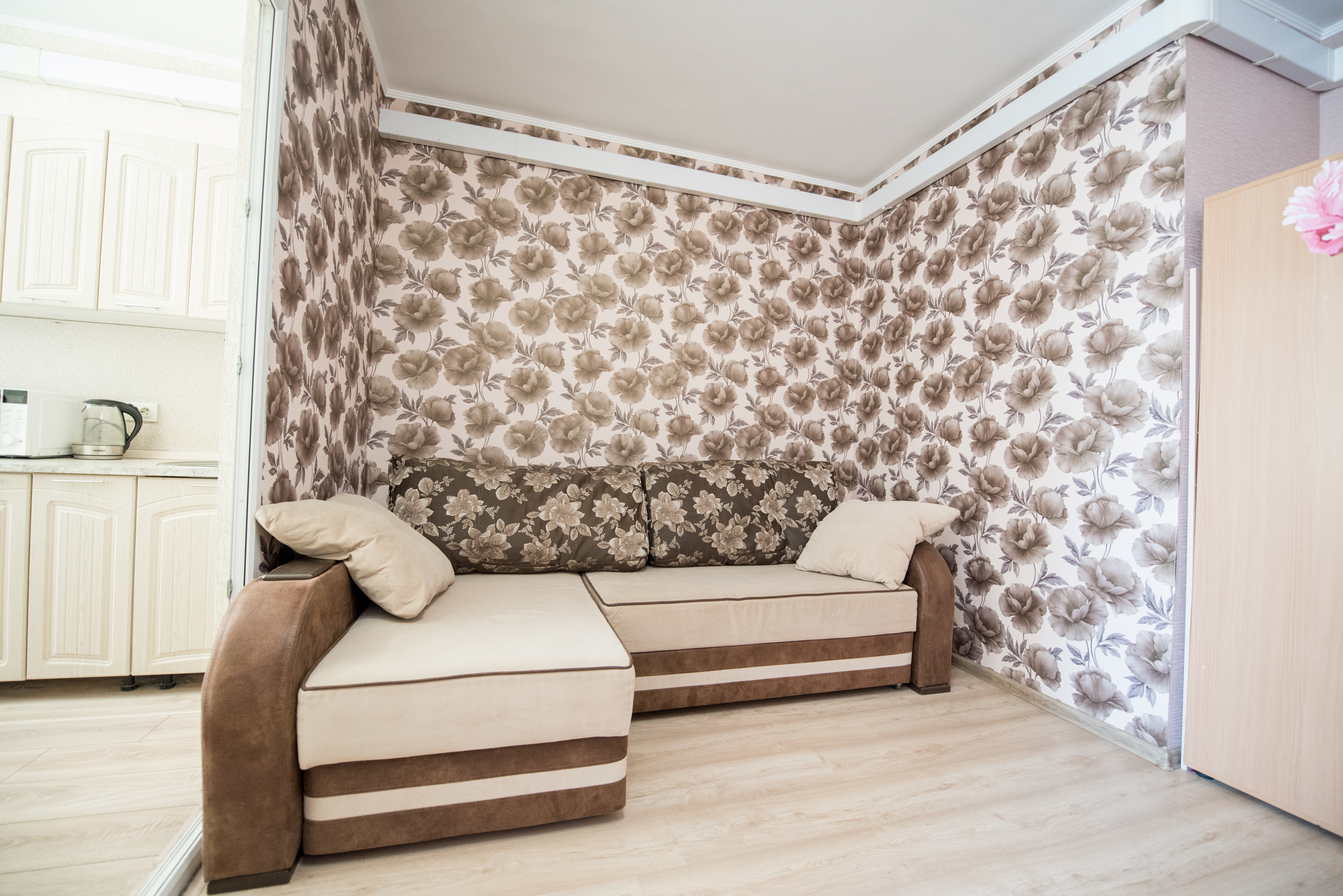 В квартире имеется большая двуспальная кровать, а также 2 удобных дивана, которые легко трансформируются в дополнительные спальные места. Таким образом, здесь с комфортом могут разместиться до 5 человек.