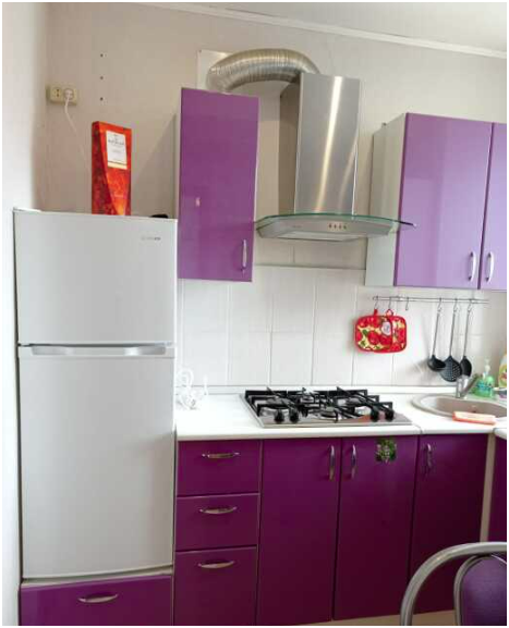 Кухня с необходимой посудой для приготовления, микроволновка, холодильник, электрический чайник.