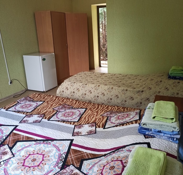 Номера «Стандарт», окно выходит на Восточную сторону, в номере прохладно,т.к первый этаж зелень укрывает от солнца. В комнате: санузел, тумбочка, шкаф, трюмо, ТВ, холодильник, Wi-Fi, 3 кровати.