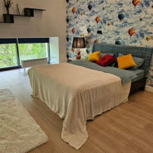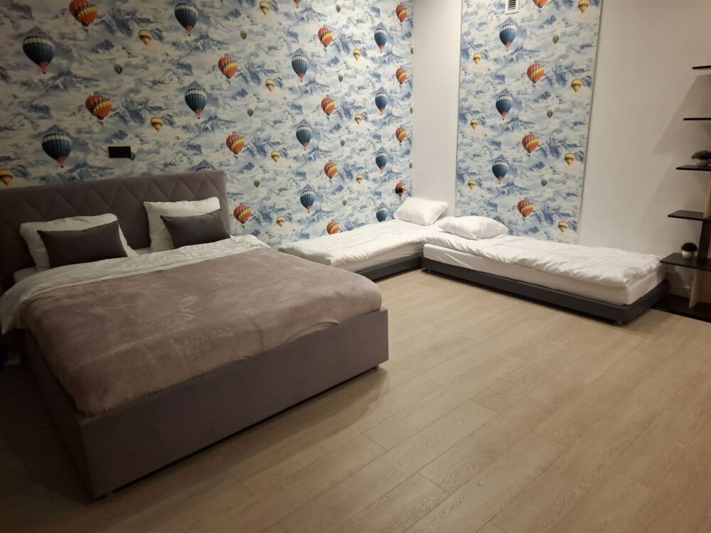 6 спальных мест: двуспальная кровать, 2 кроватных бокса с матрасом на втором этаже и раскладной двухспальный диван на первом этаже в кухне-гостинной. Также при необходимости можем принести еще 2 односпальных раскладных кресла- кровати с матрасами 80х200 из соседнего апартамента.