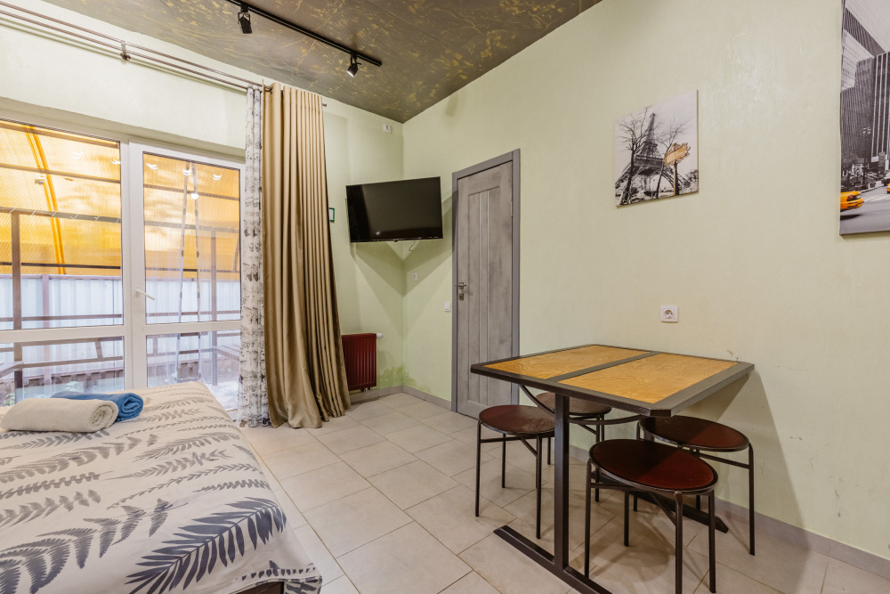 Студия в новом доме, с личной террасой, закрытой парковкой, беседкой и мангалом. Территория утопает в зелени и цветах!