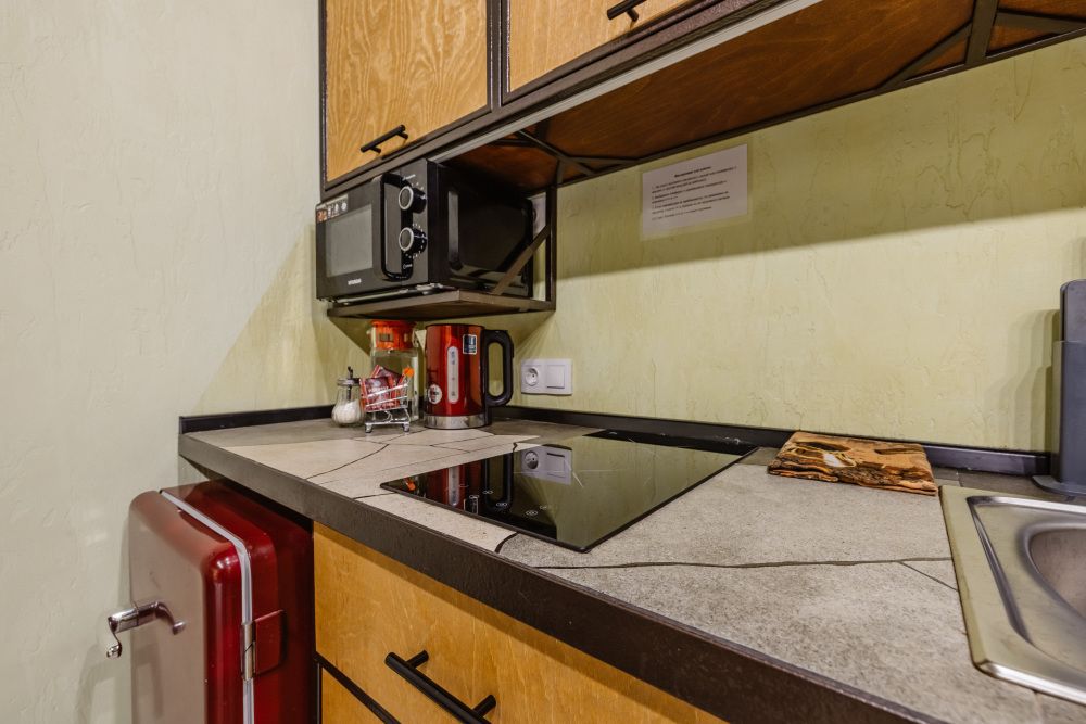 Кухня с индукционной плитой, холодильником, электрическим чайником, микроволновкой, обеденной зоной.