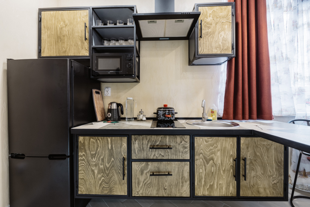 Кухня с индукционной плитой , холодильником, электрическим чайником, СВЧ-печью, обеденной зоной.