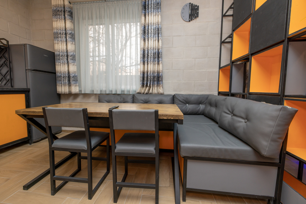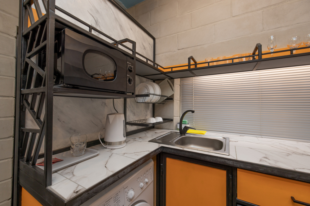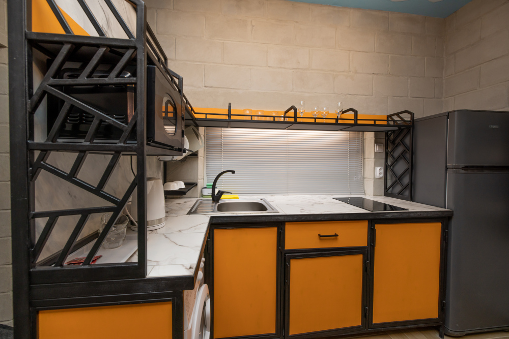 Кухня с индукционной плитой, холодильником, электрическим чайником, микроволновкой, обеденной зоной.