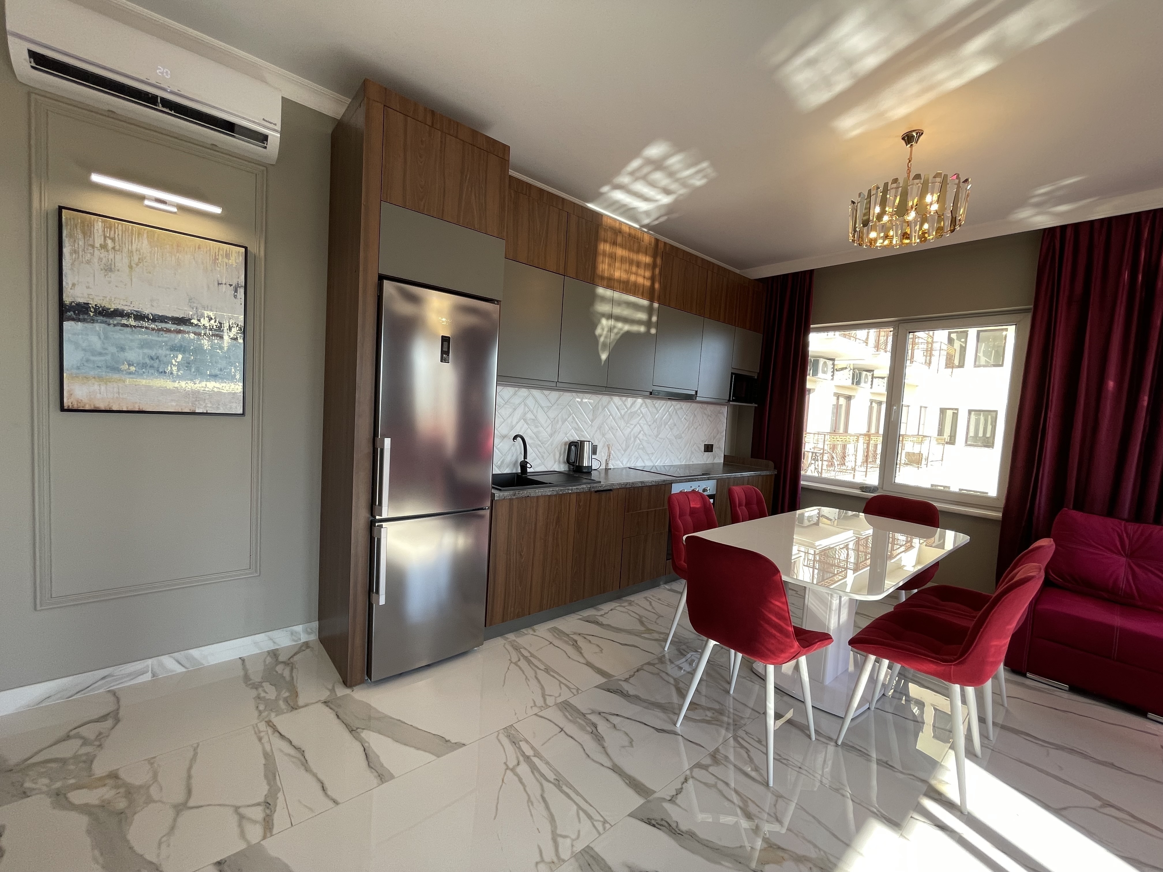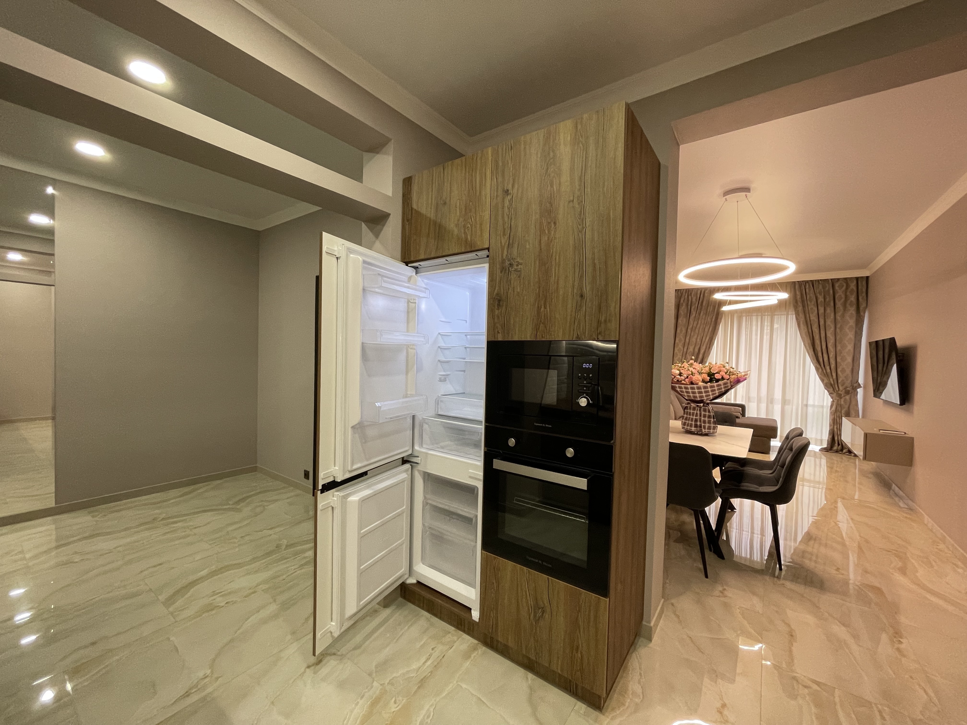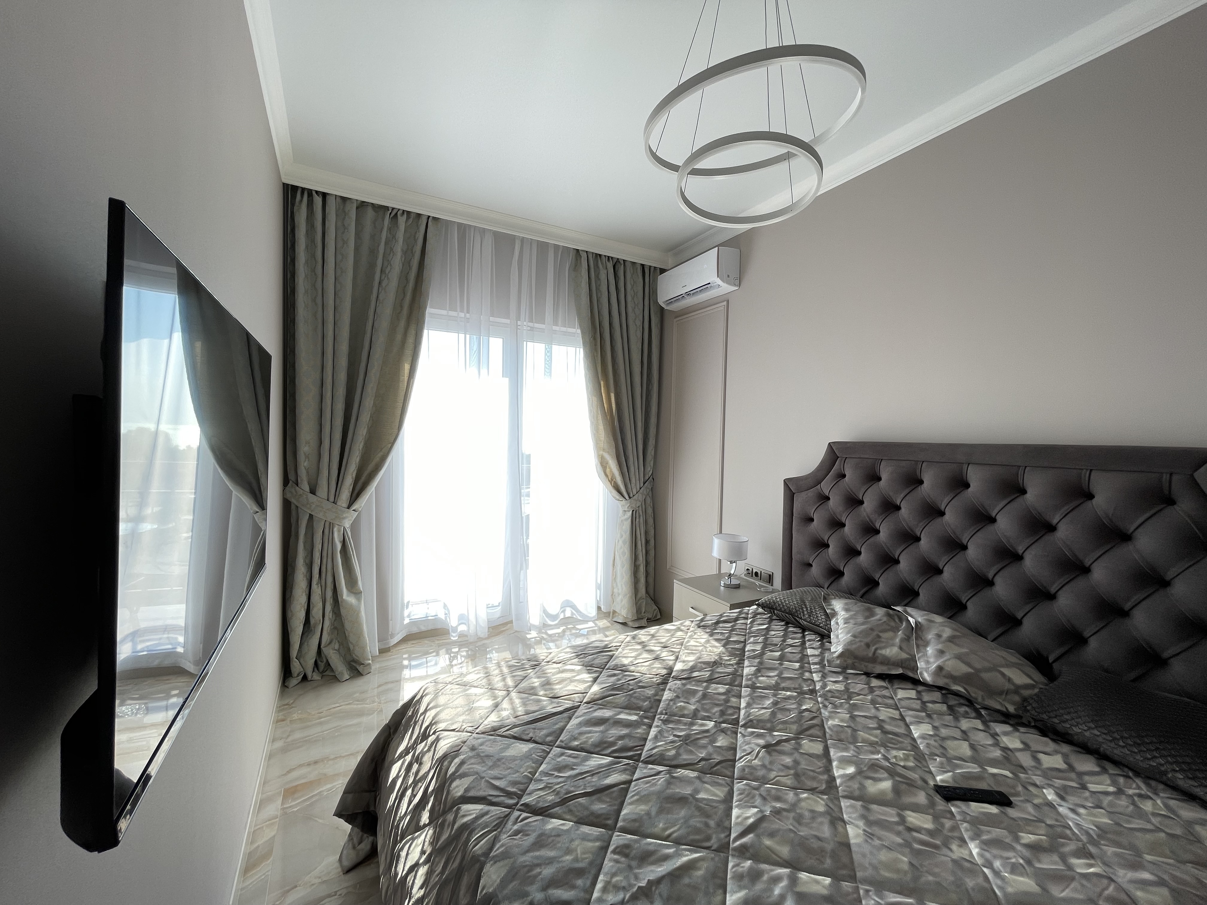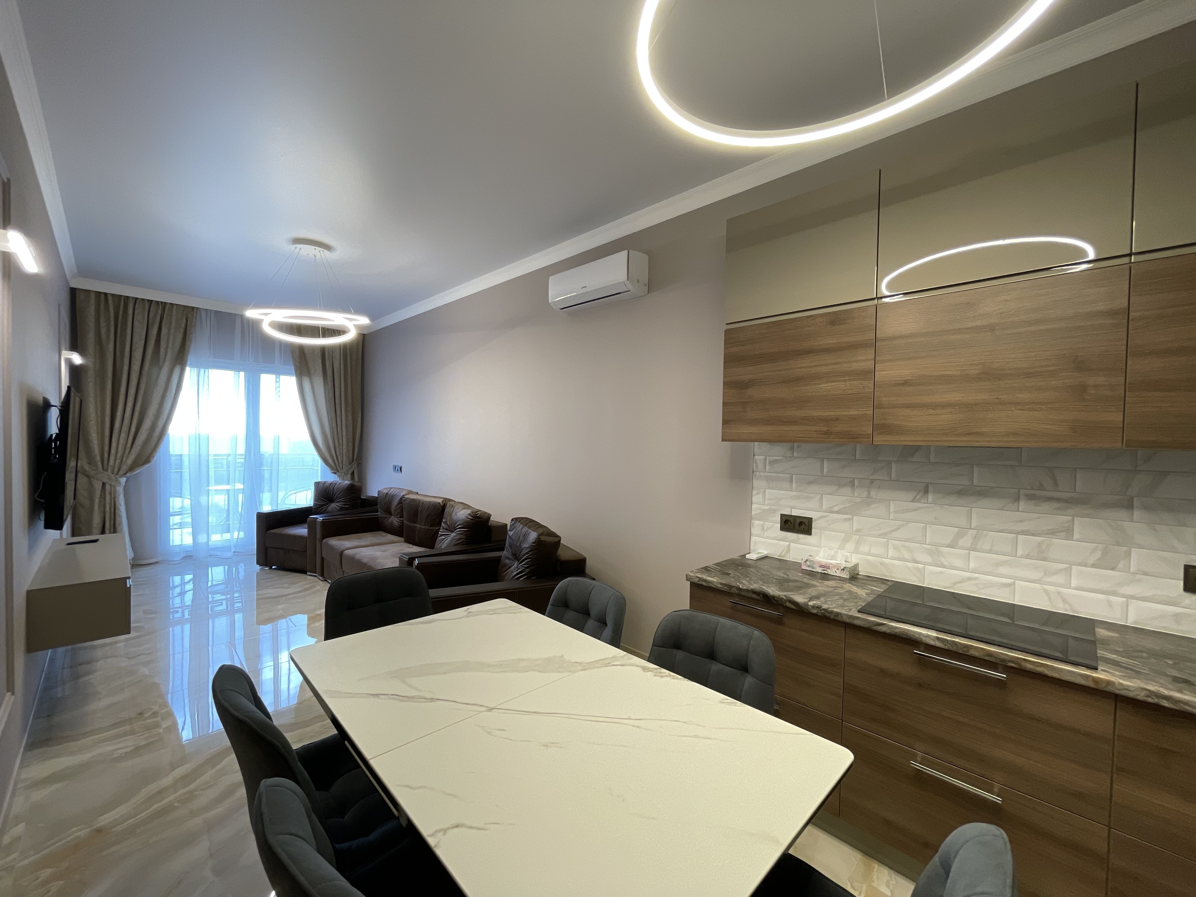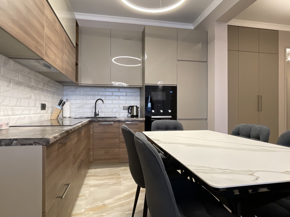 В квартире есть всё необходимое для проживания: холодильник, микроволновка, духовка, посудомоечная машина, кондиционер, стиральная машина, Wi-Fi и телевидение.