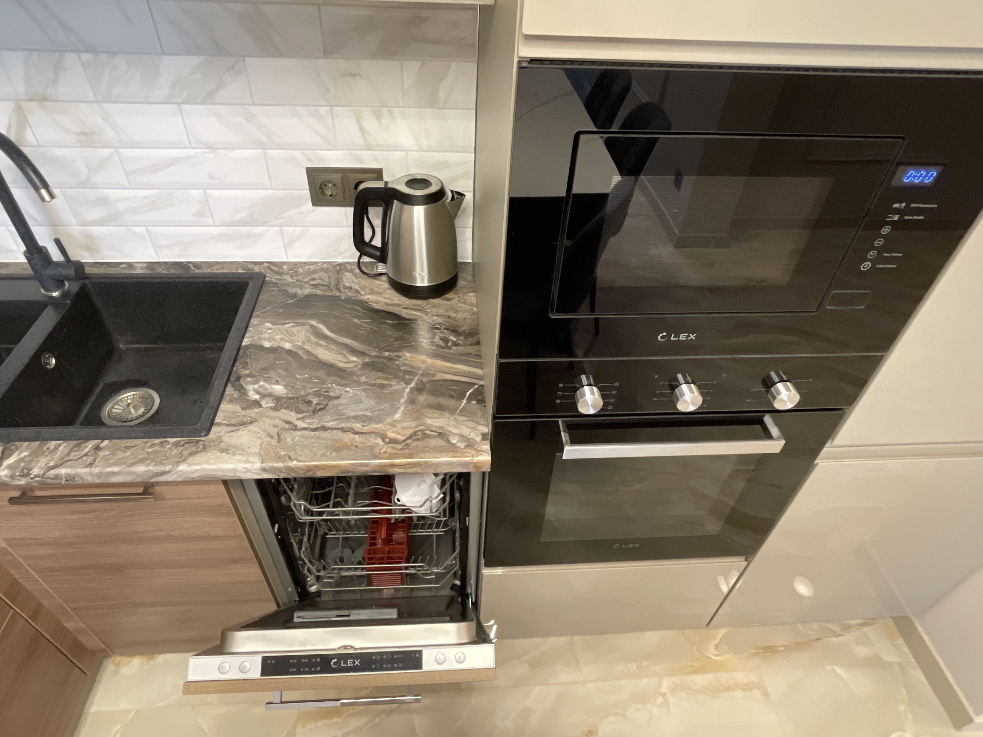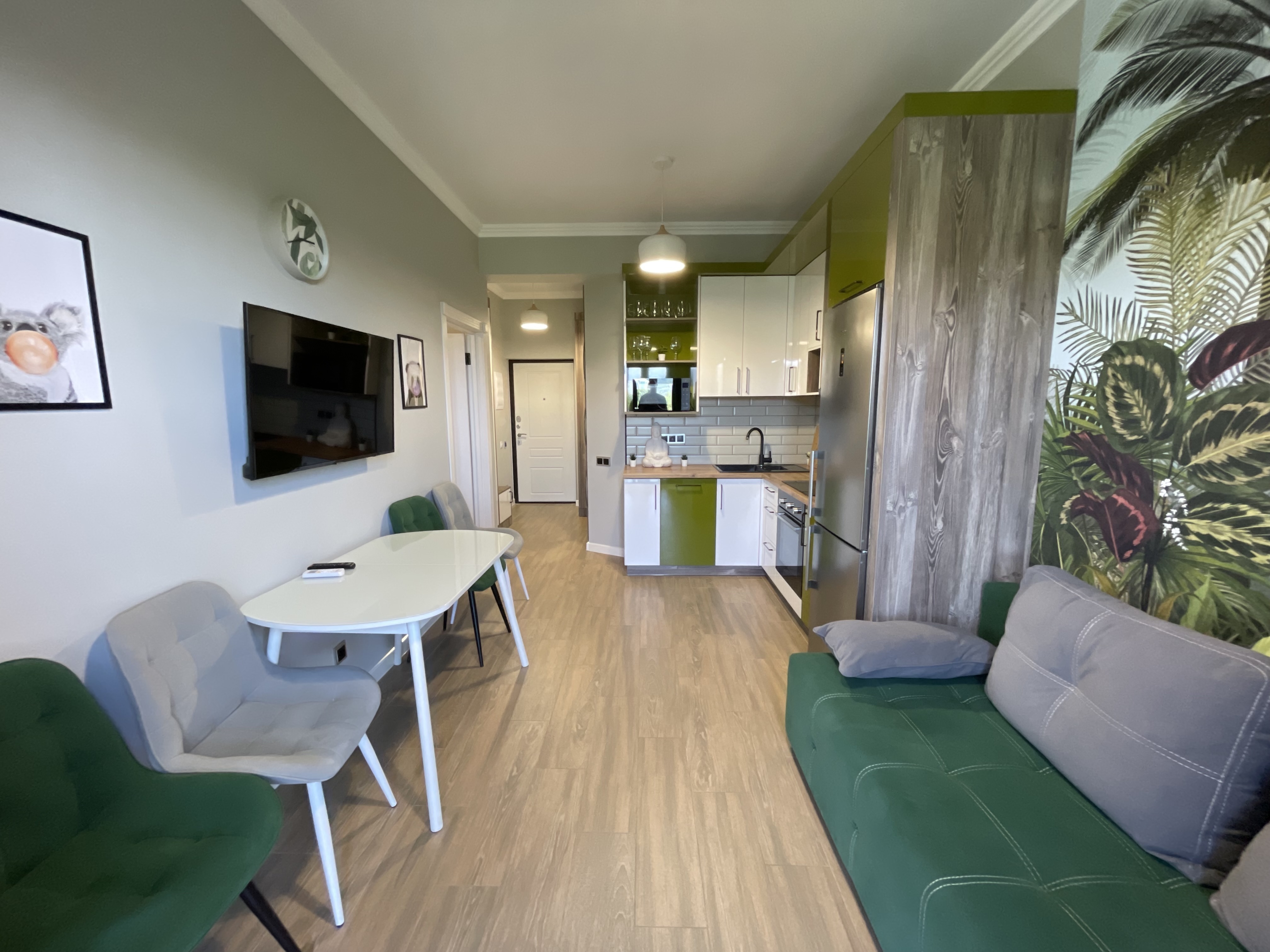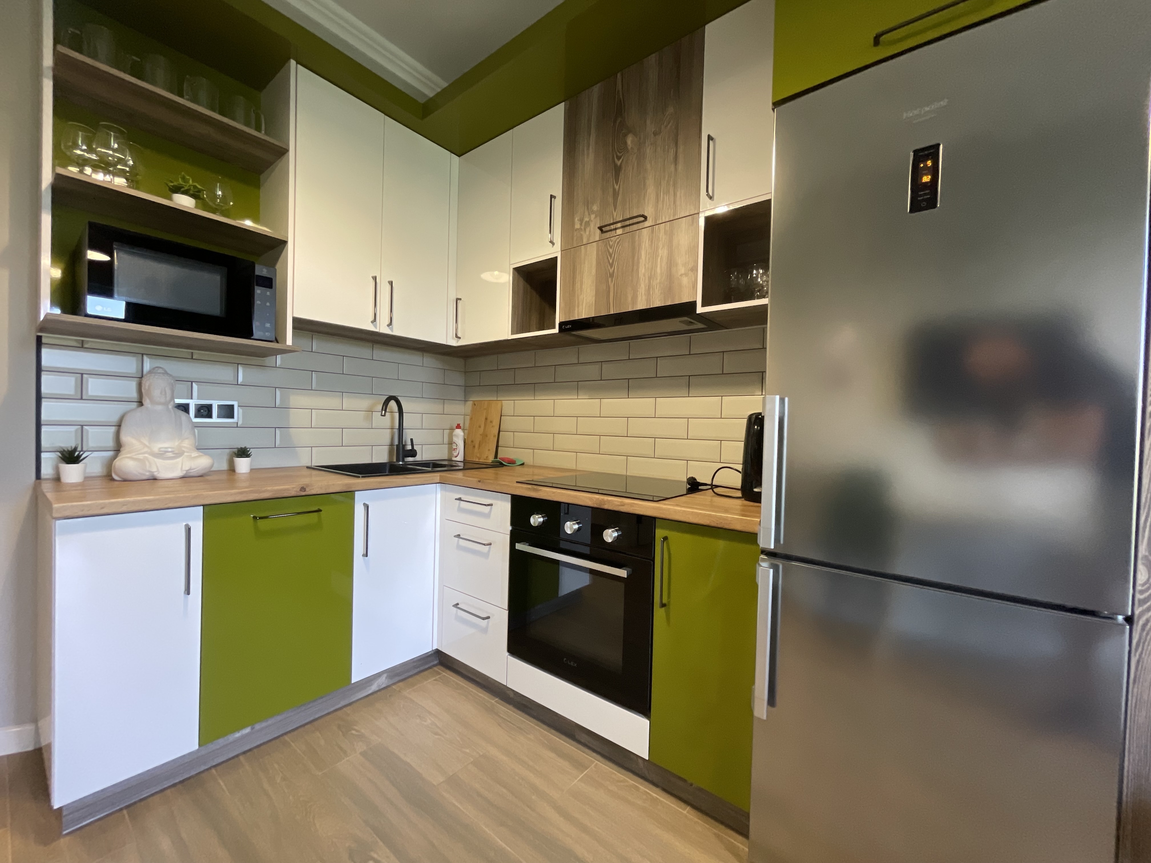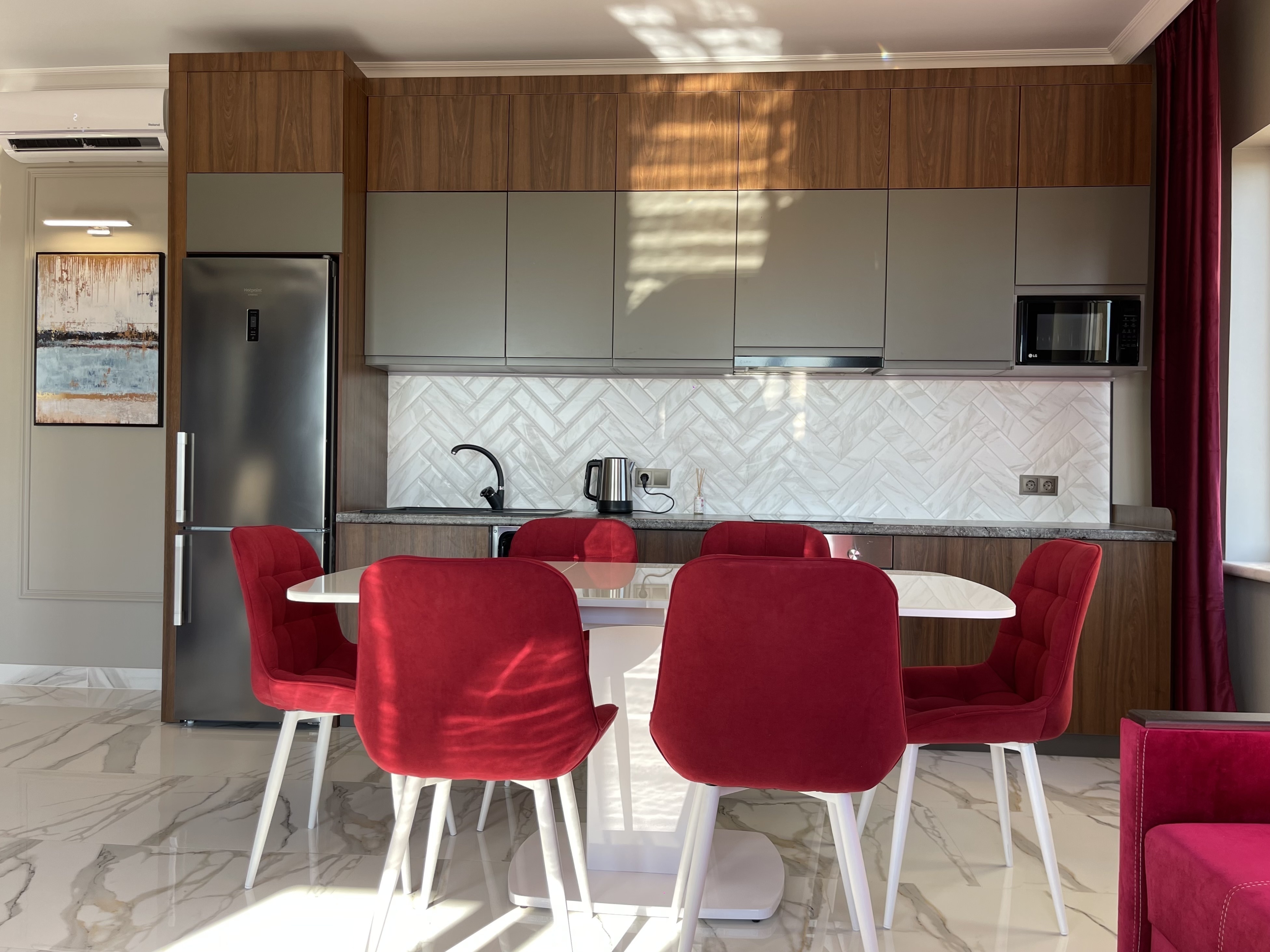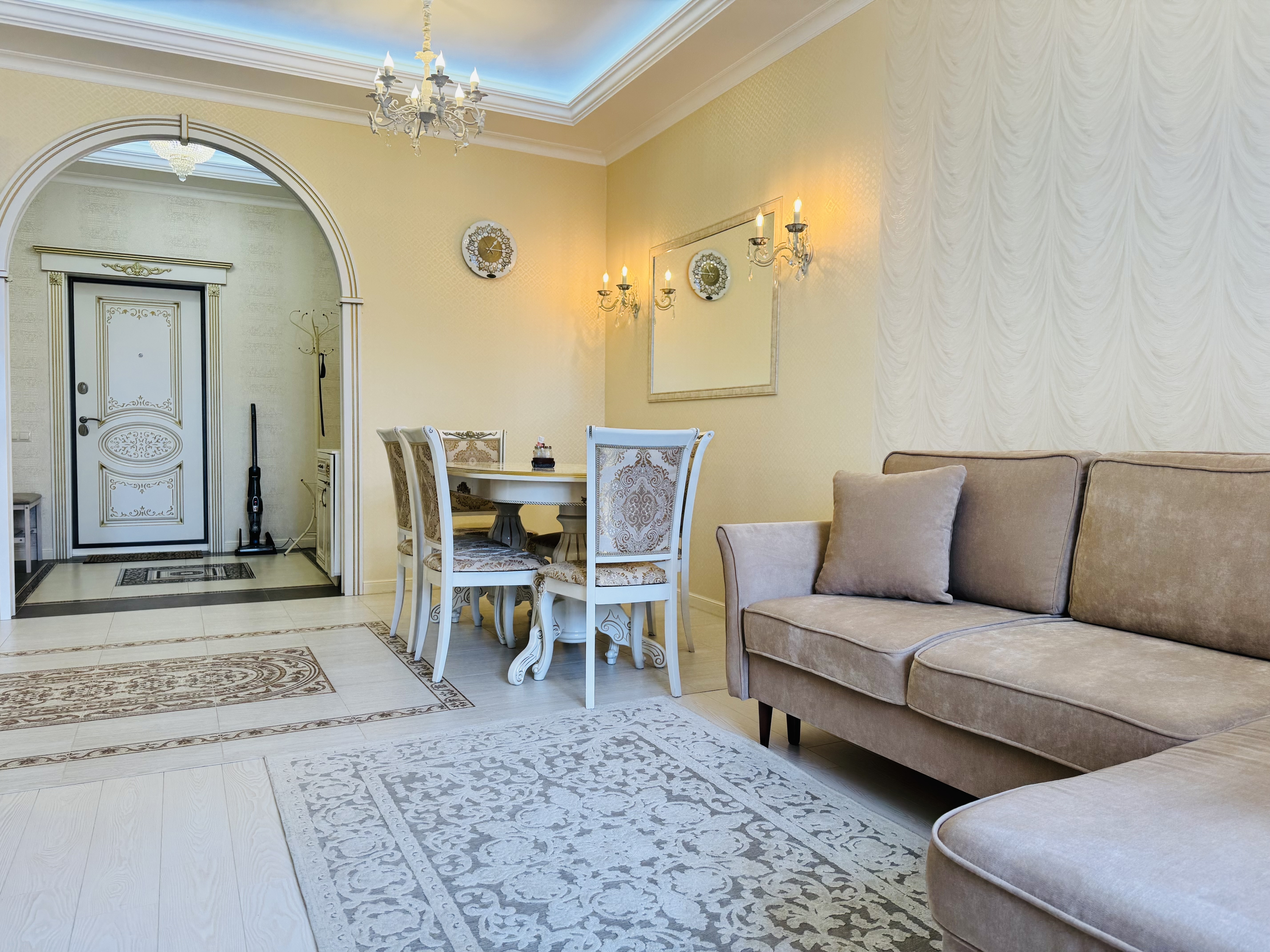 В квартире есть всё необходимое для проживания: холодильник, микроволновка, духовка, посудомоечная машина, кондиционер, стиральная машина, Wi-Fi и телевидение.