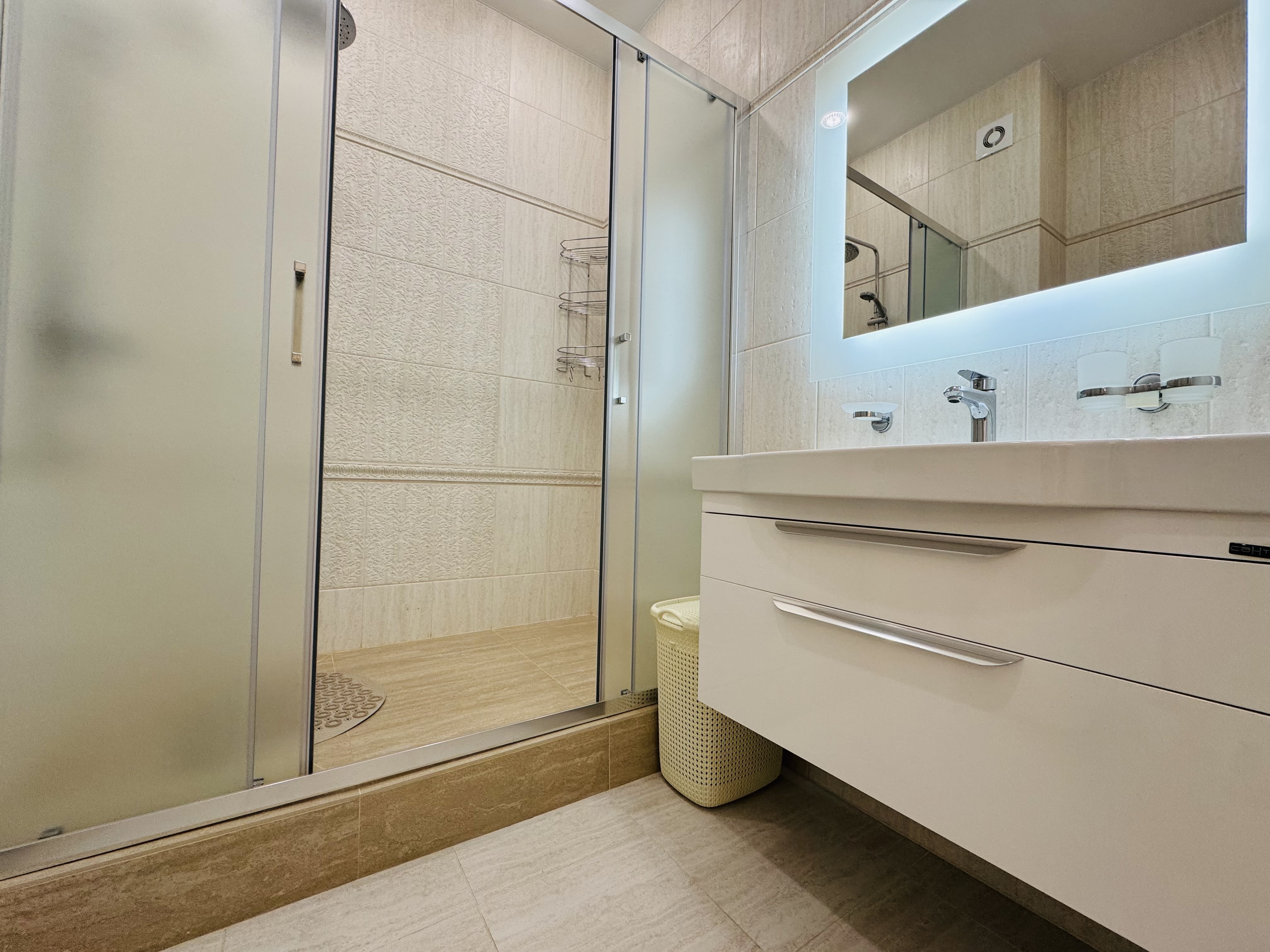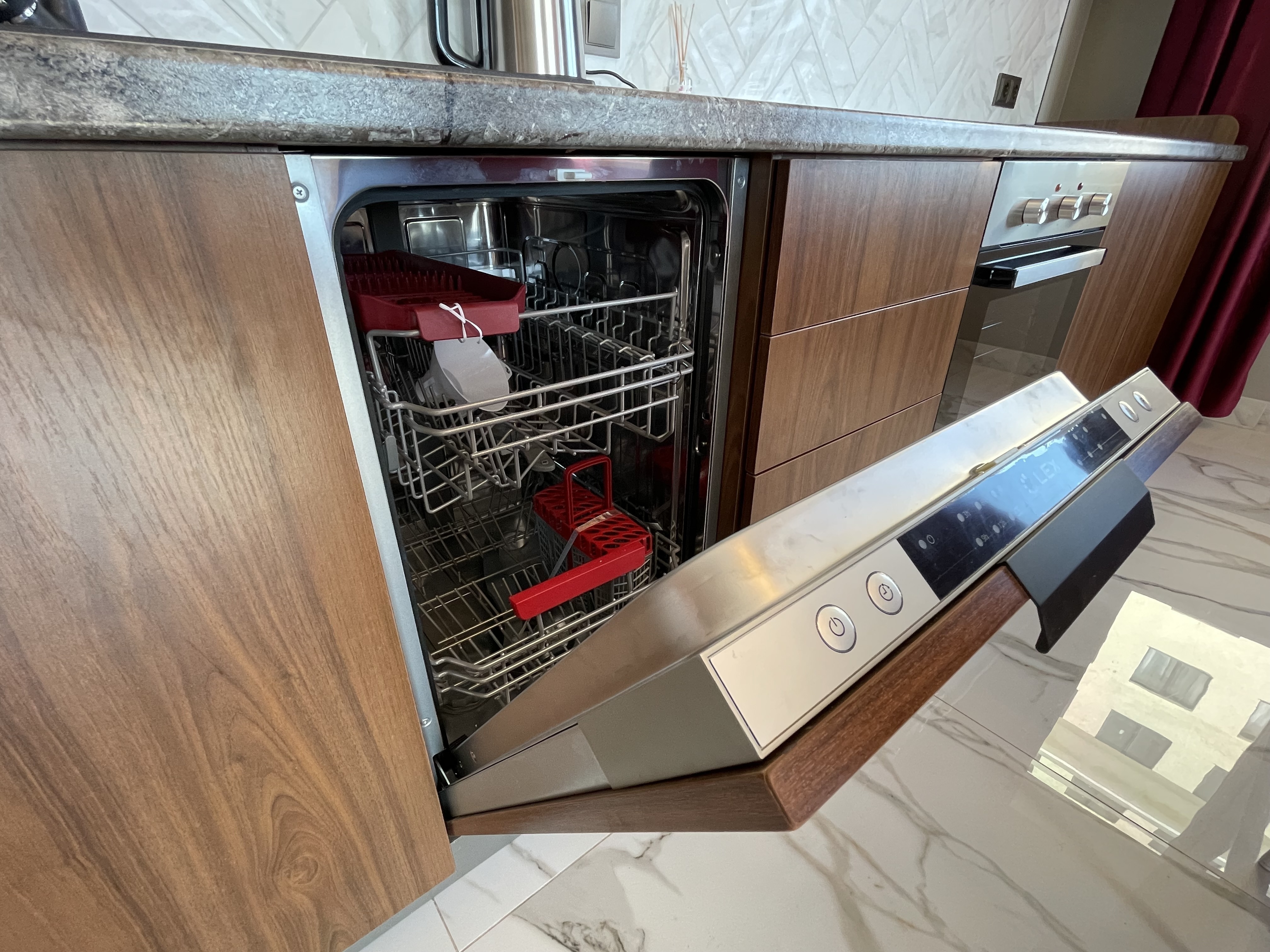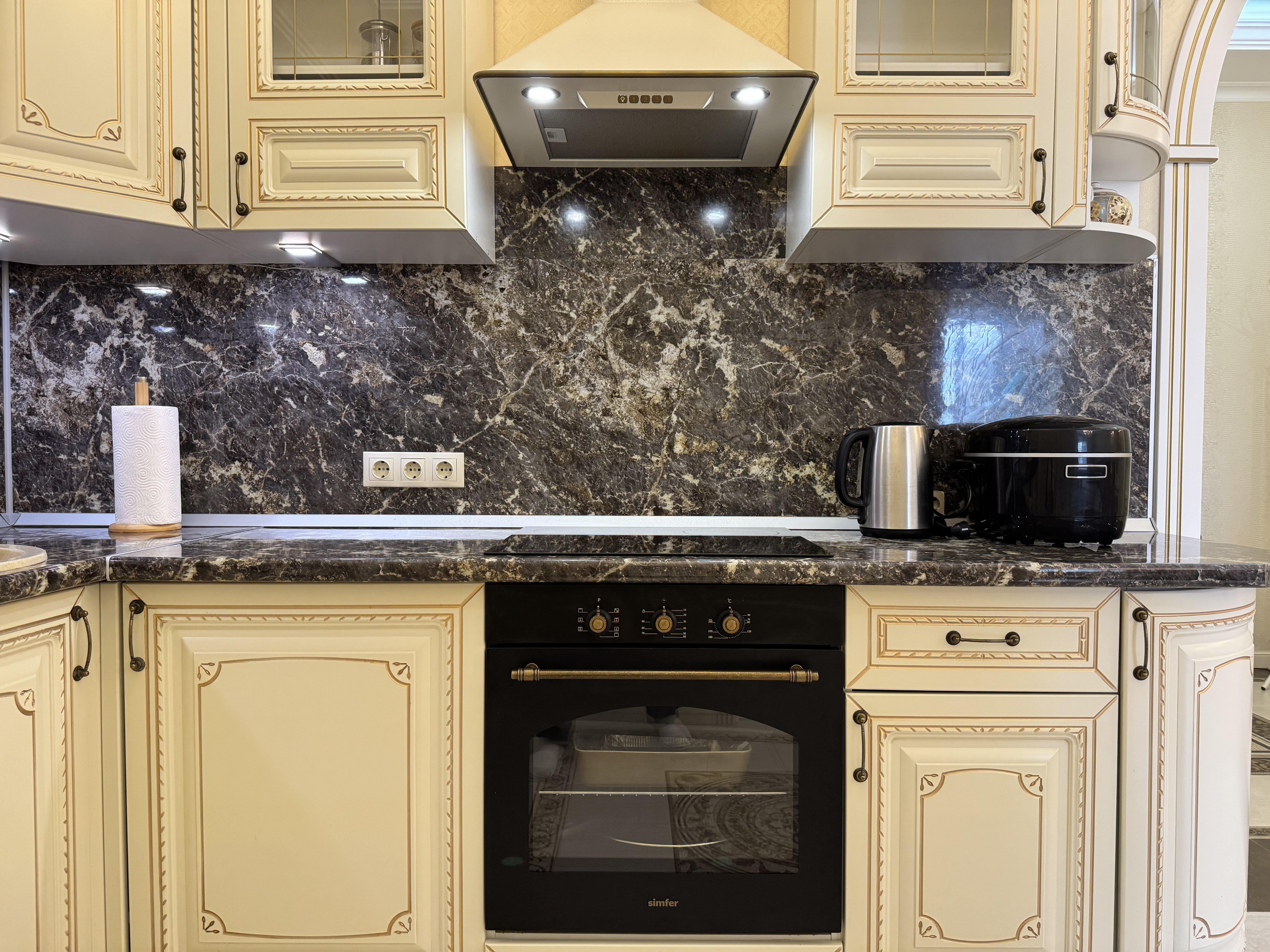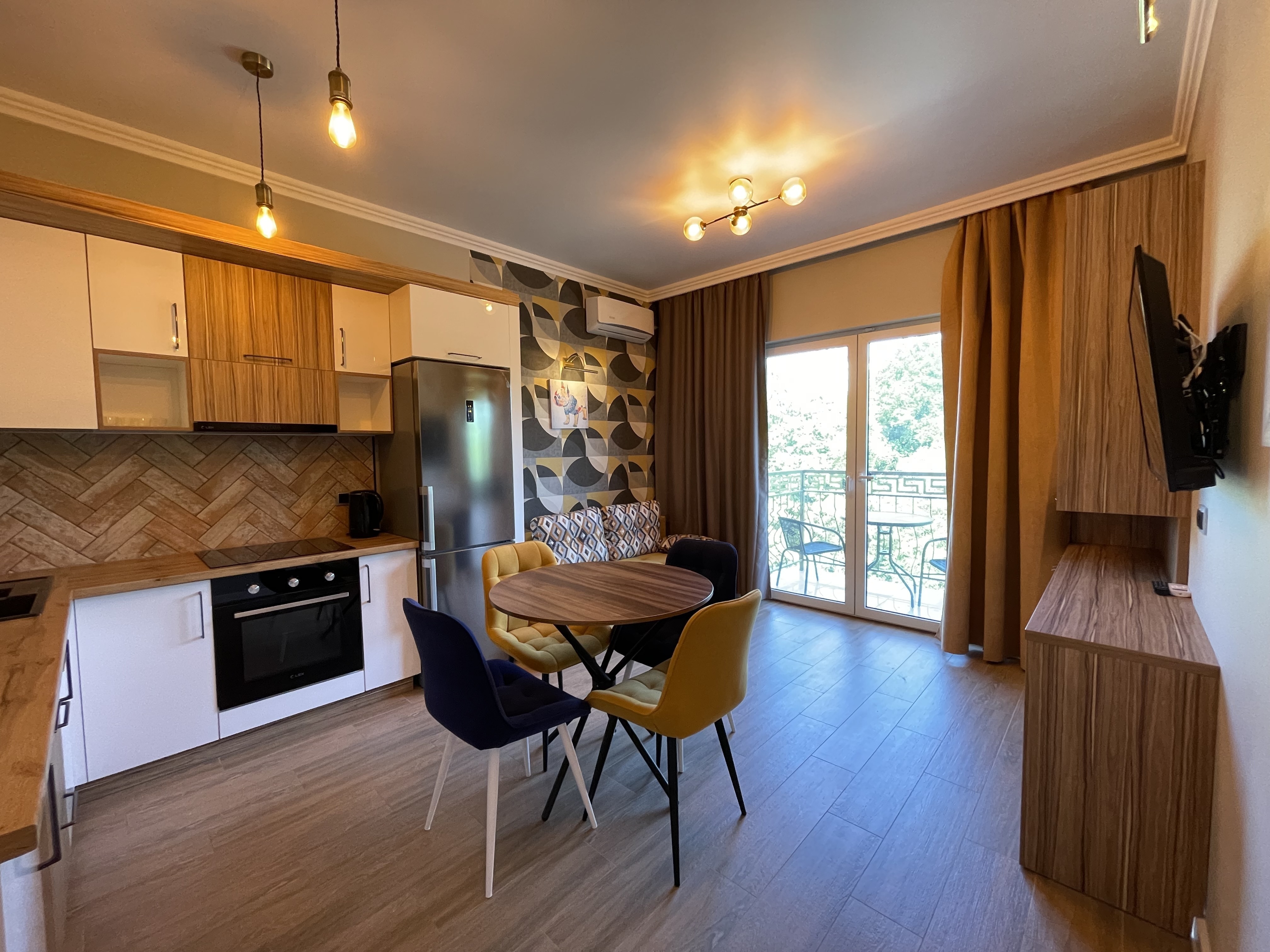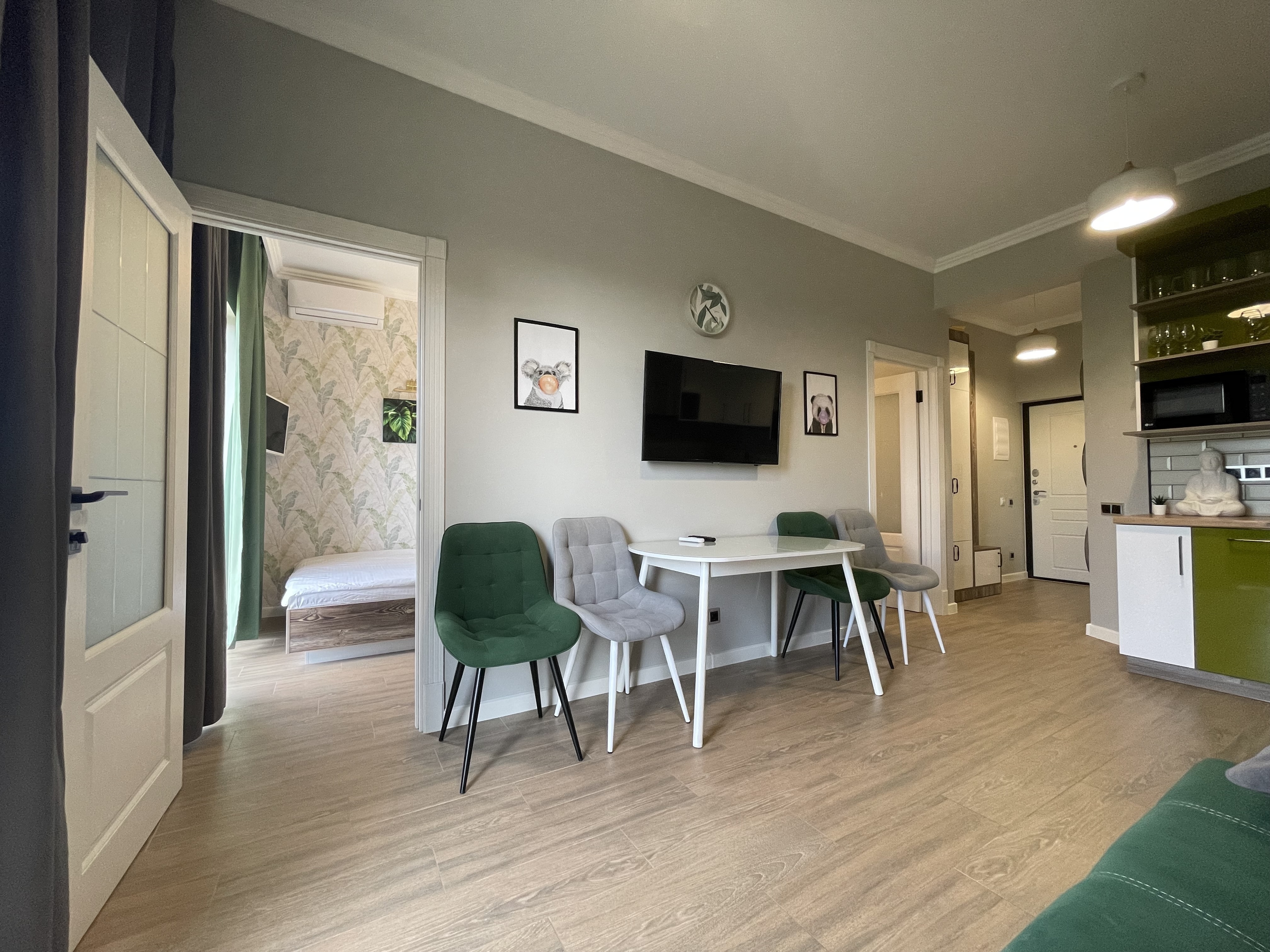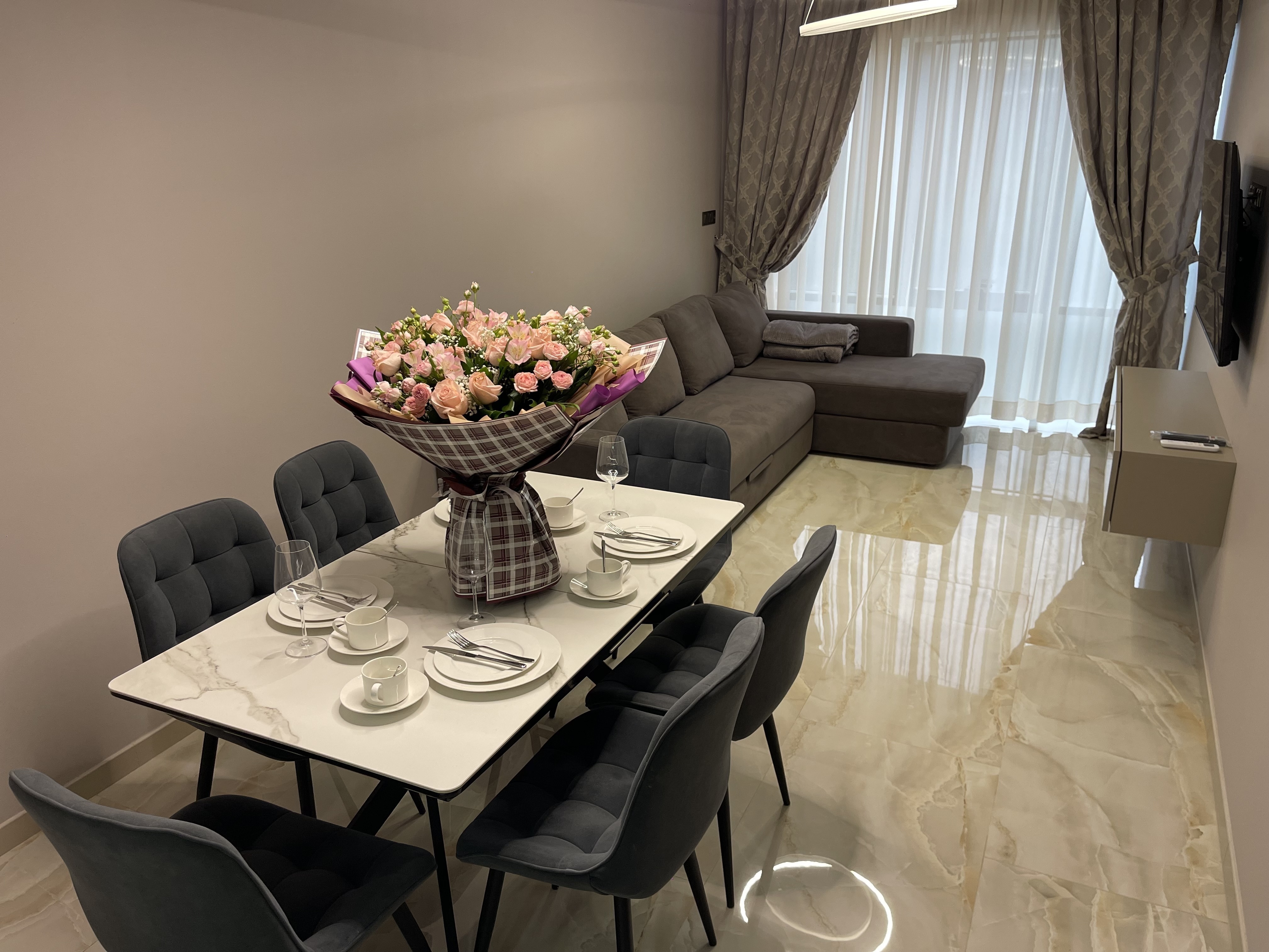В квартире есть всё необходимое для проживания: холодильник, микроволновка, духовка, посудомоечная машина, кондиционер, стиральная машина, Wi-Fi и телевидение.
