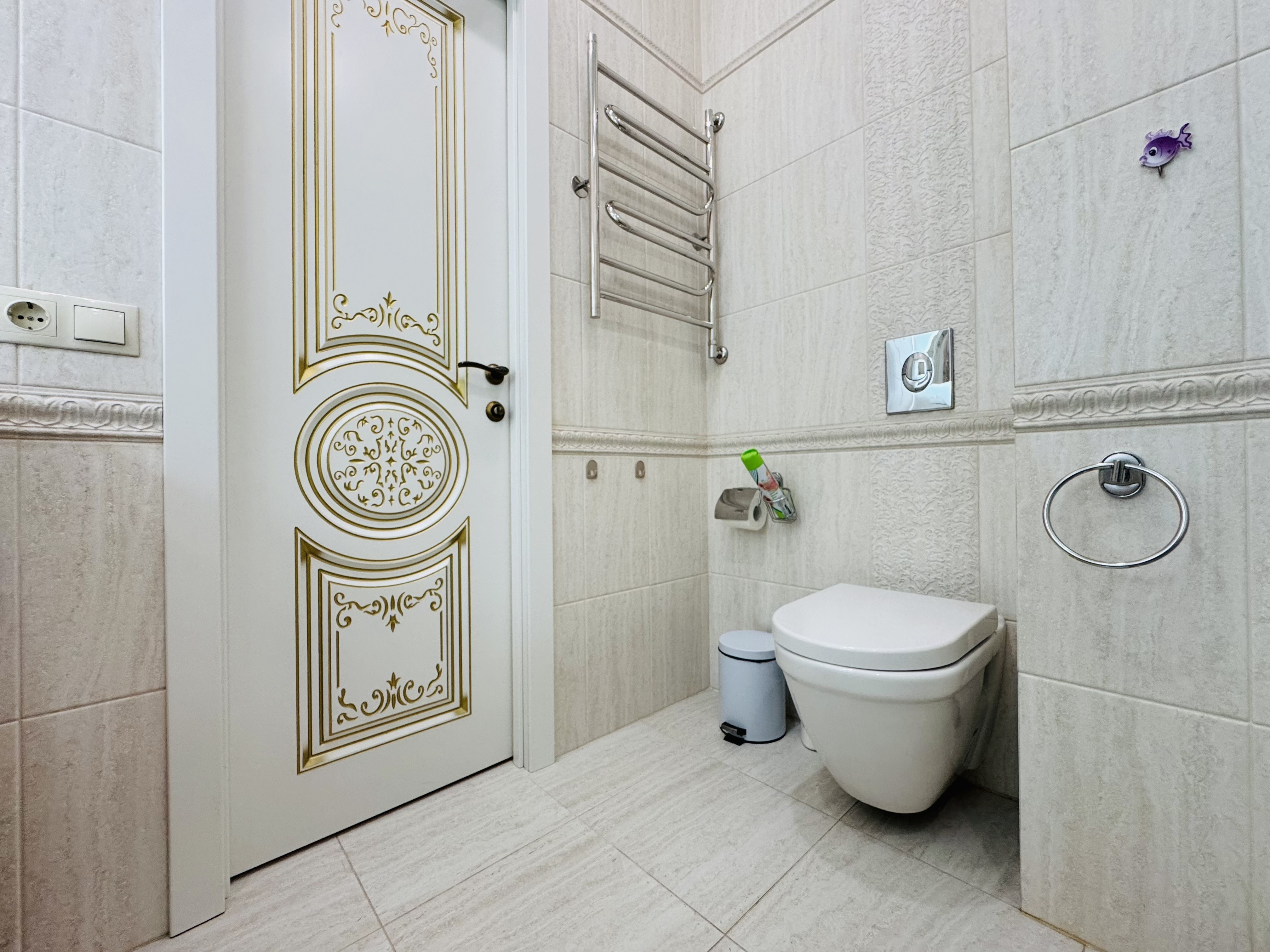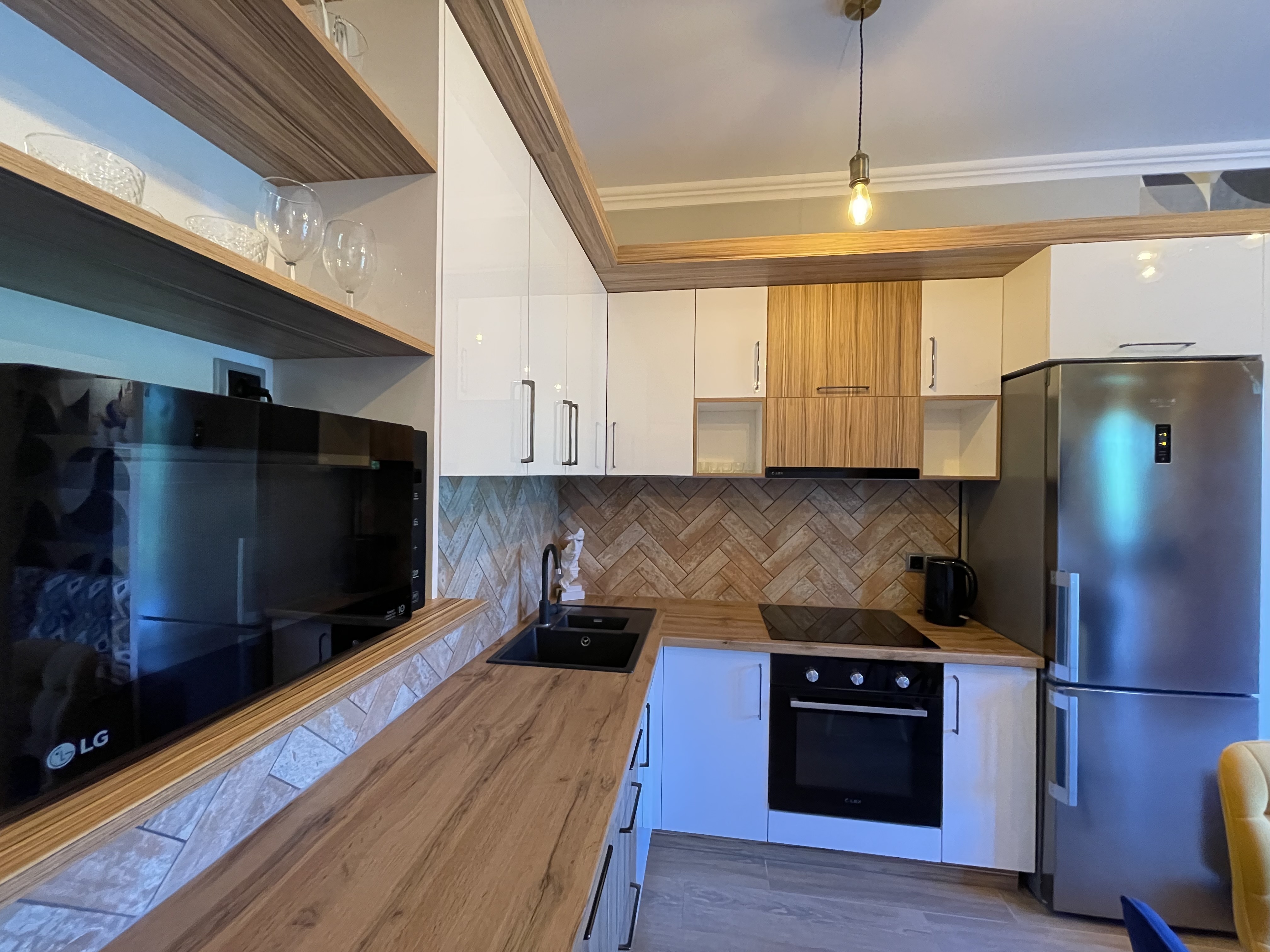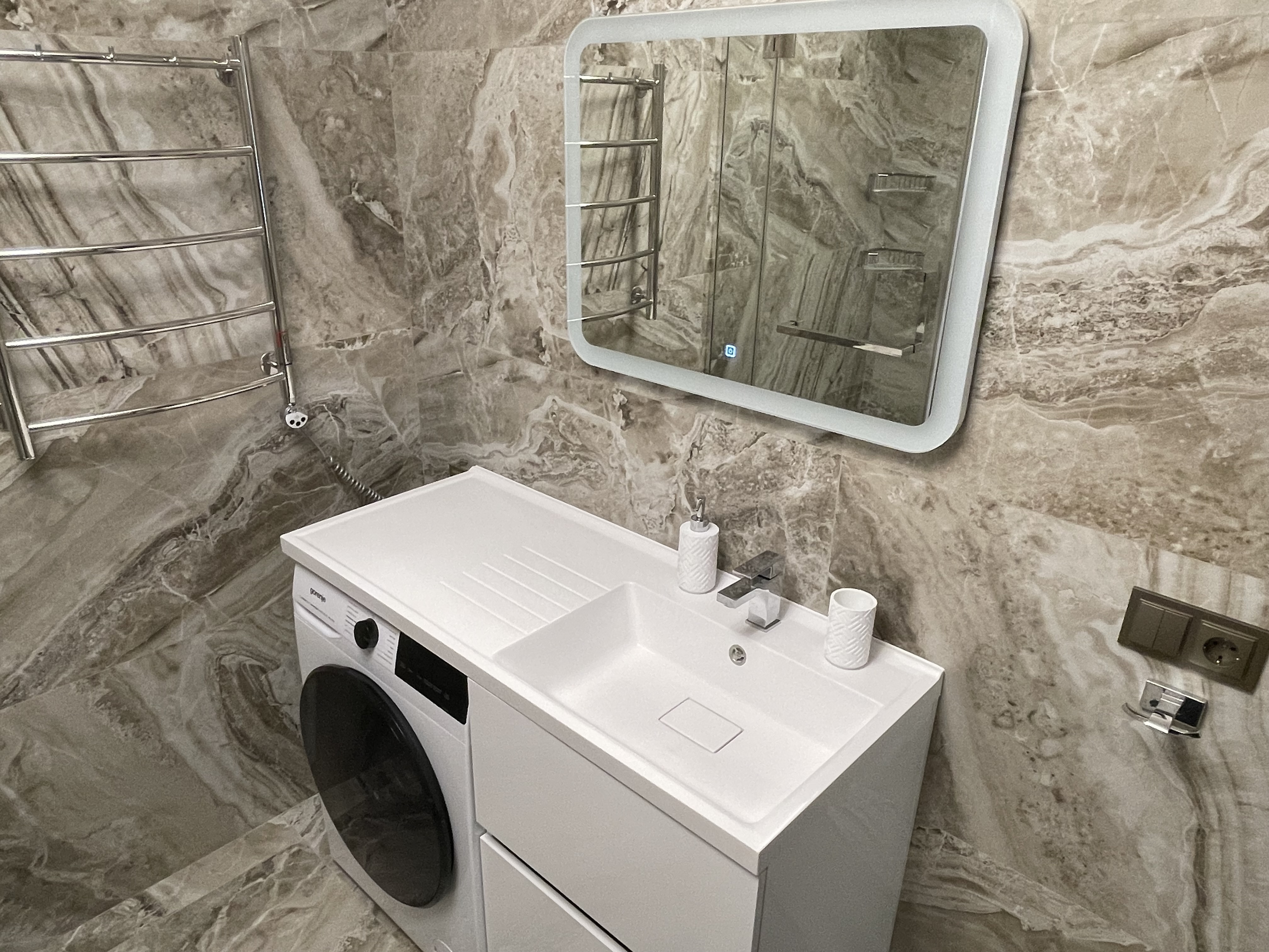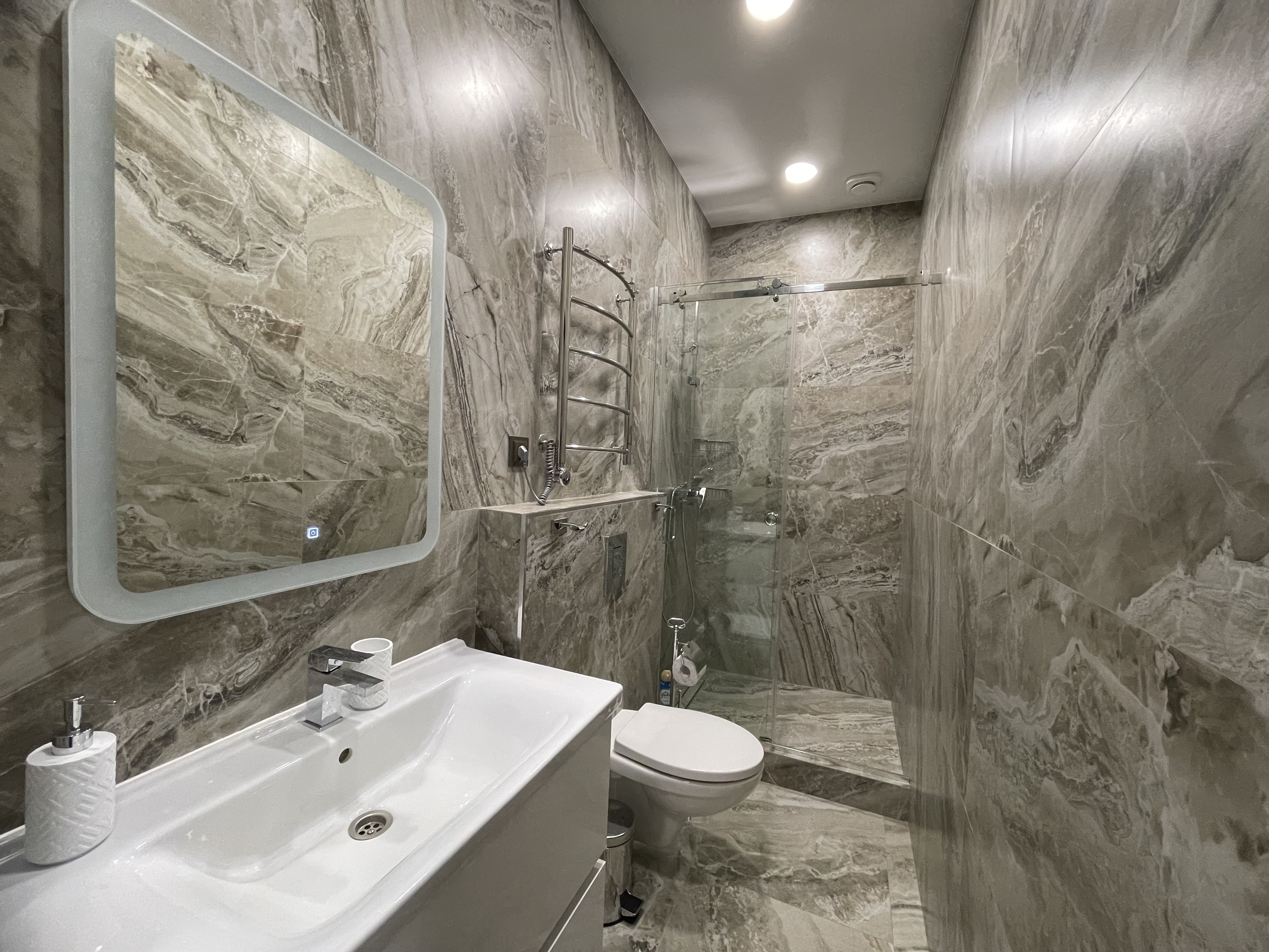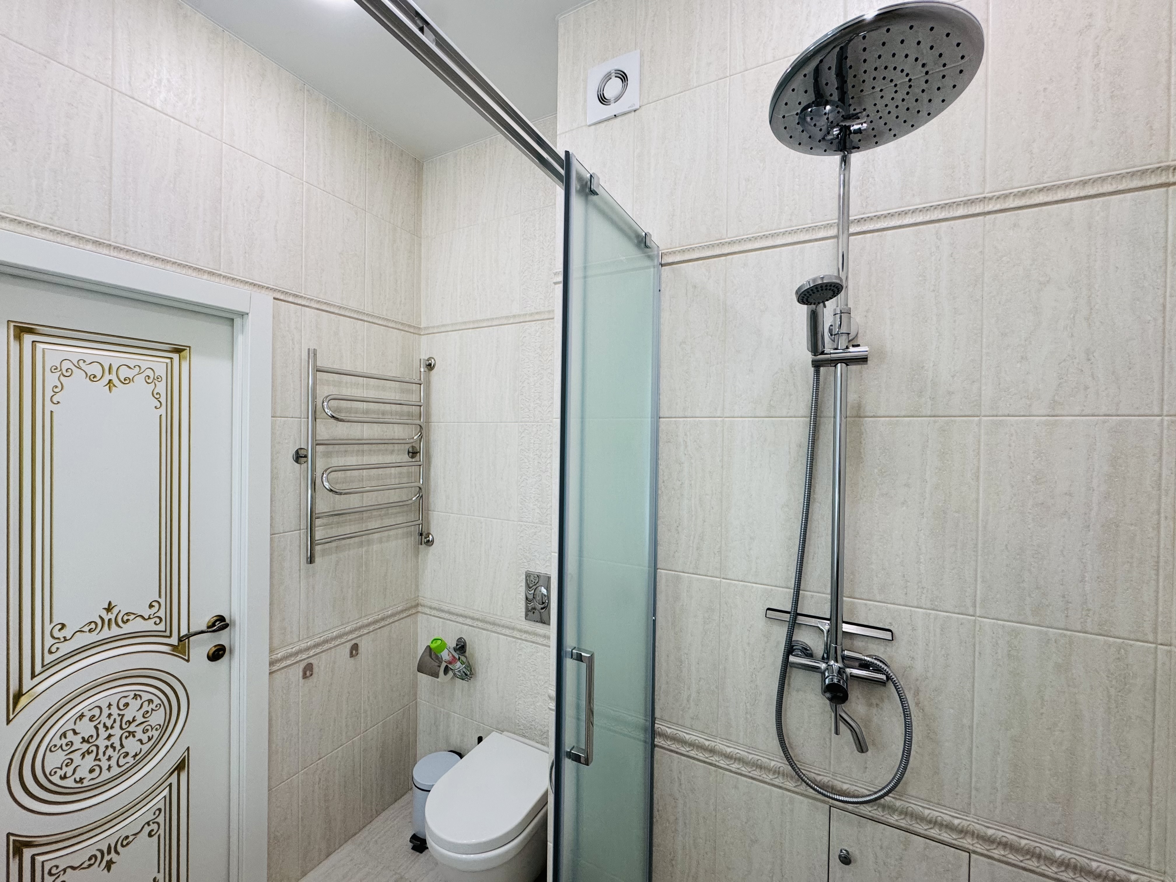 В квартире есть всё необходимое для проживания: холодильник, микроволновка, духовка, посудомоечная машина, кондиционер, стиральная машина, Wi-Fi и телевидение.