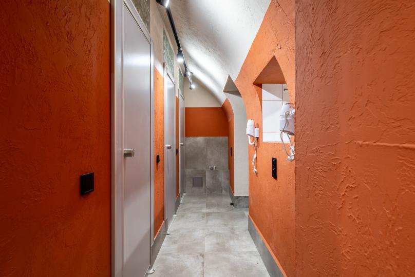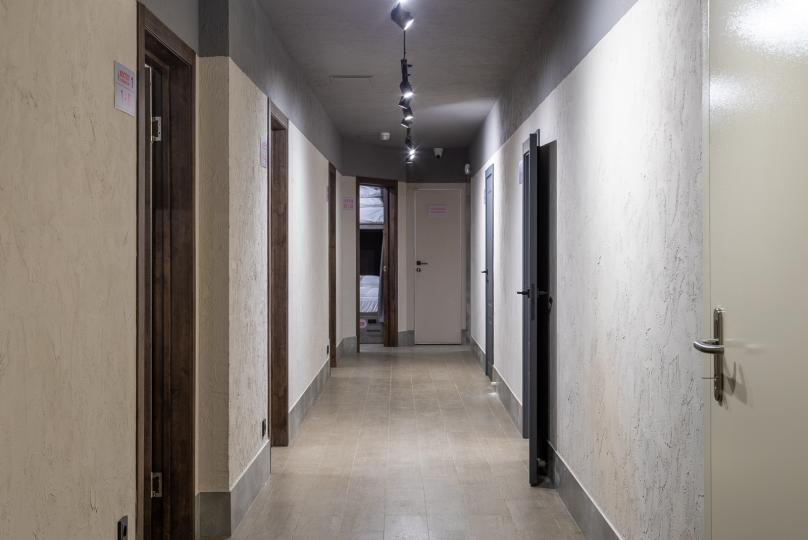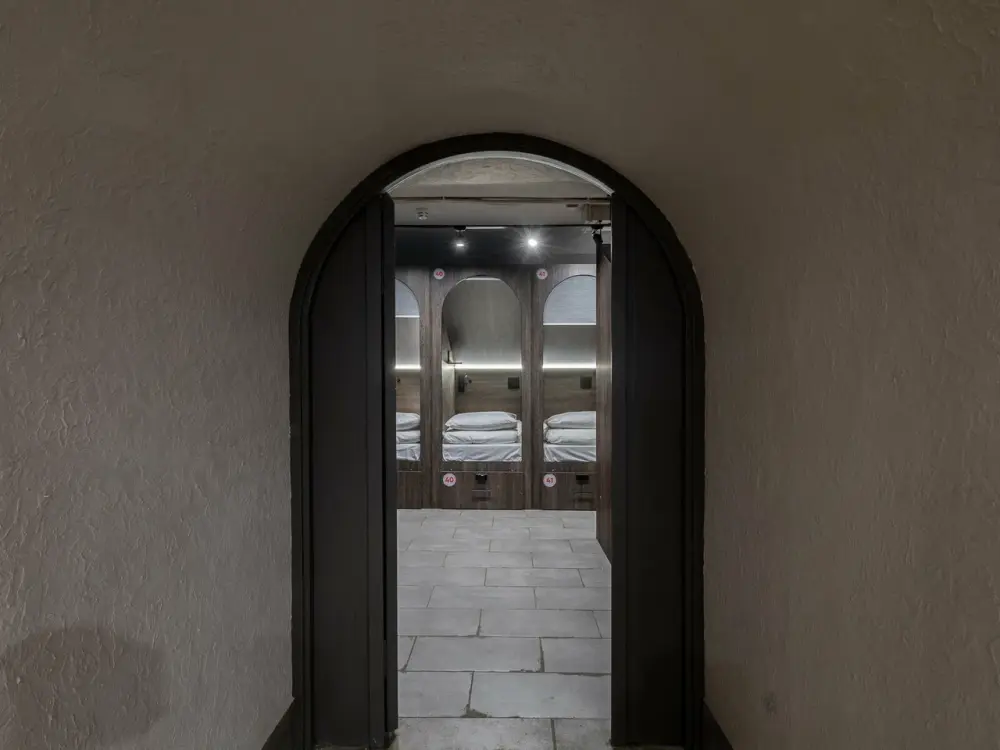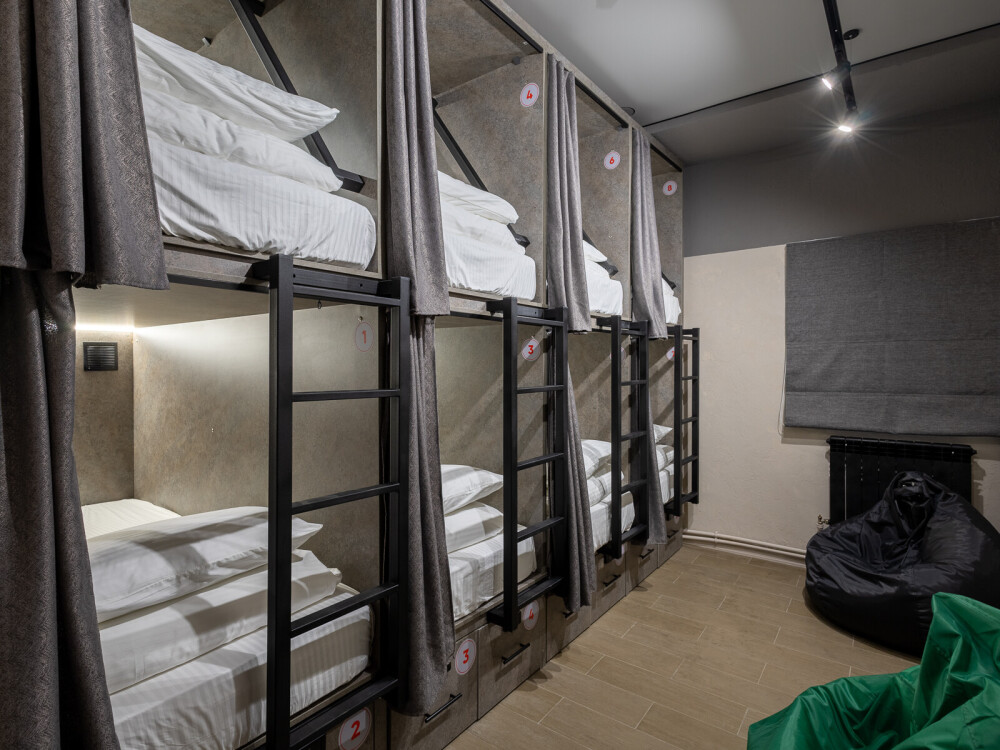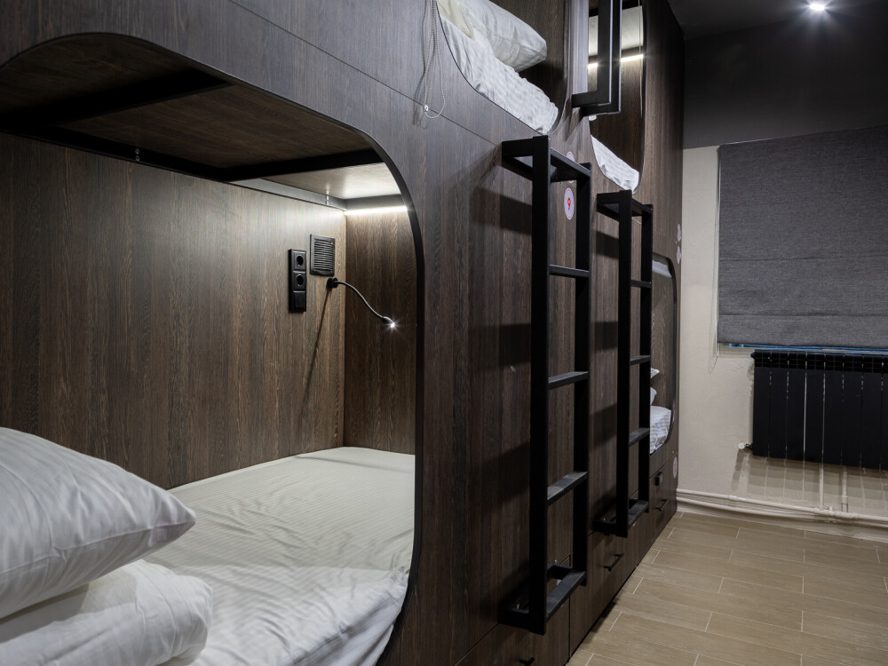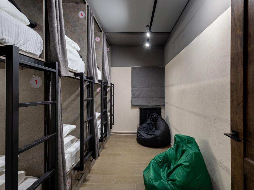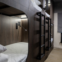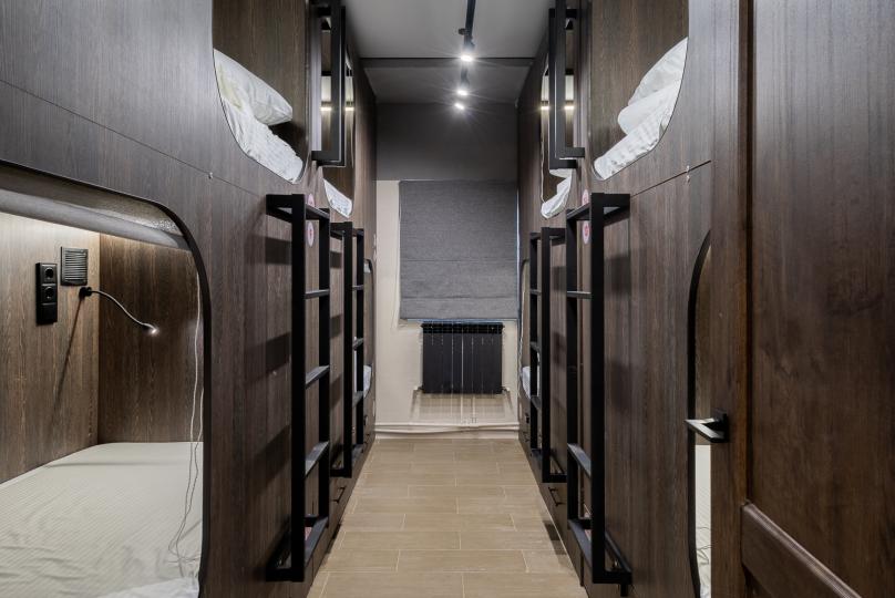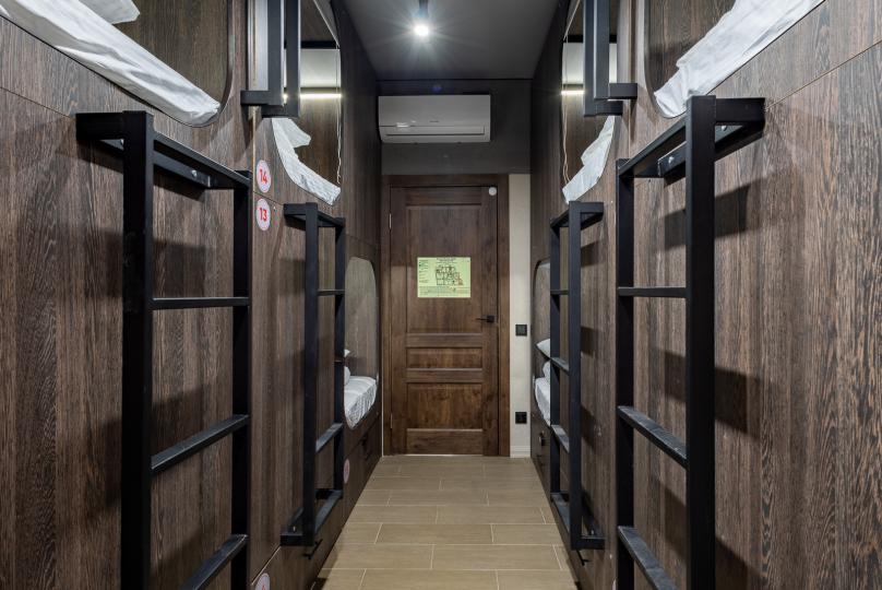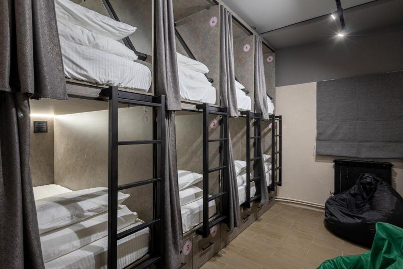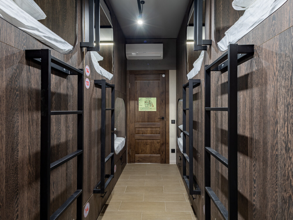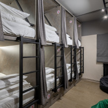 Восьмиместный номер с двухъярусными кроватями. Каждая кровать выполнена в формате капсулы, каждая капсула закрывается плотной шторкой, так же каждая капсула оснащена индивидуальным освещением, вентилятором, розеткой и бра на гибком шланге для чтения. В комнате есть кондиционер и окно.