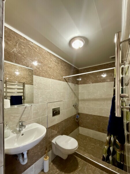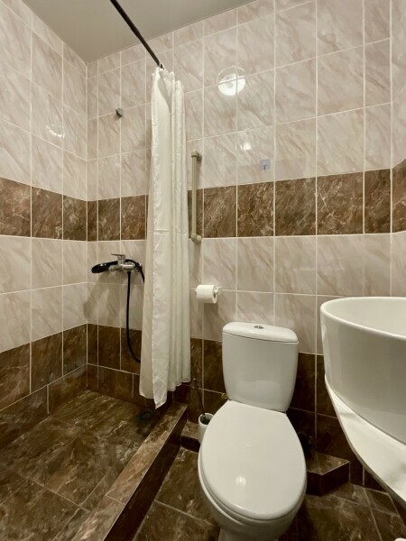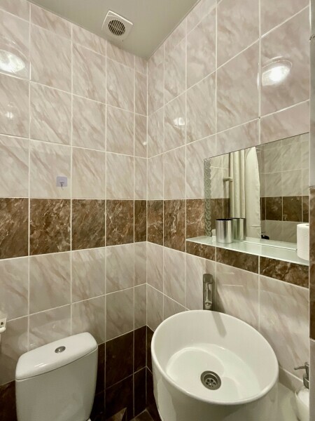 Во всех номерах в санузлах есть зеркала, фены, дозаторы с жидким мылом, одноразовые шампунь и гель для душа, тапочки. Полотенце все.
