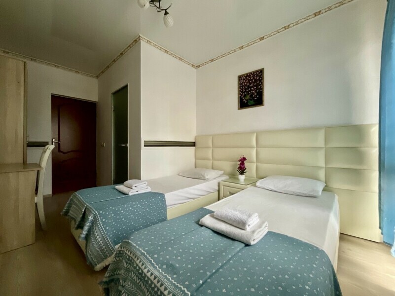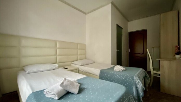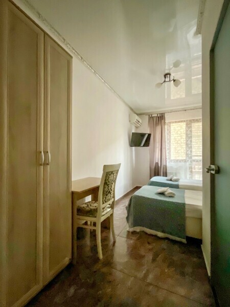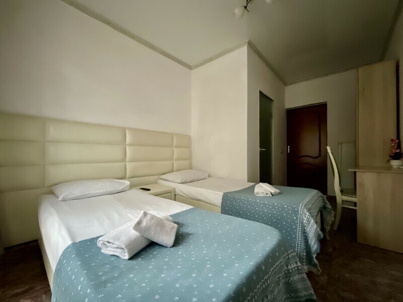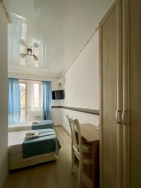 В двухместных номерах раздельные кровати односпальные, телевизор, кондиционер, шкаф, стол, стул, прикроватная тумба, балкон и санузел с душем, раковина, зеркало, унитаз, полотенцесушитель. И есть номера с двух спальными кроватями.