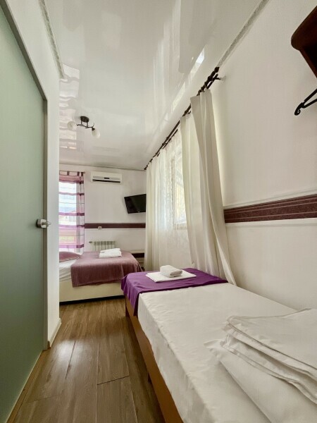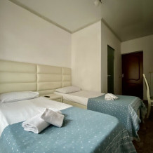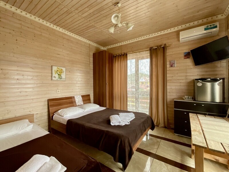 В трёхместных номерах есть мини-холодильник, телевизор, двуспальная кровать и односпальная кровать, шкаф, стол, стулья , комод, кондиционер, балкон, санузел с душем, раковина и унитаз.