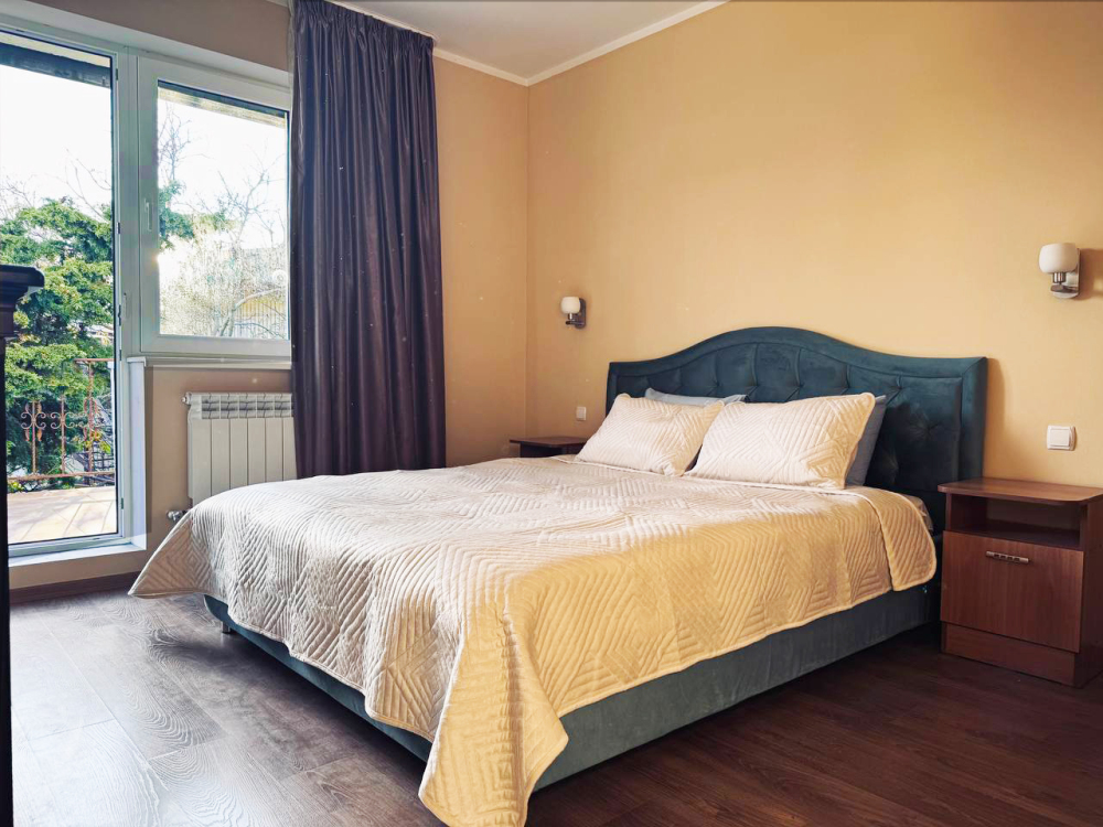 2 этаж: 2 изолированные спальни, в каждой двуспальная кровать с ортопедическим матрацем. Кабинет, санузел и отдельная душевая. Из 2-х спален выход на террасу.