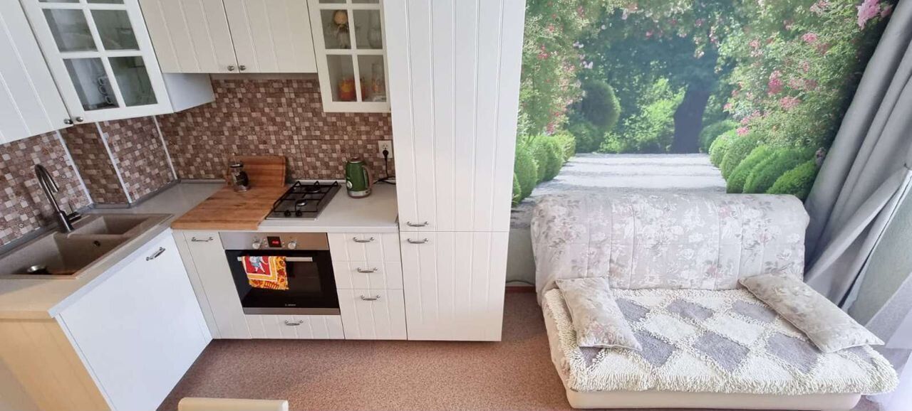 - на лоджии с панорамными окнами есть диван. В прихожей трёхметровый зеркальный шкаф купе.