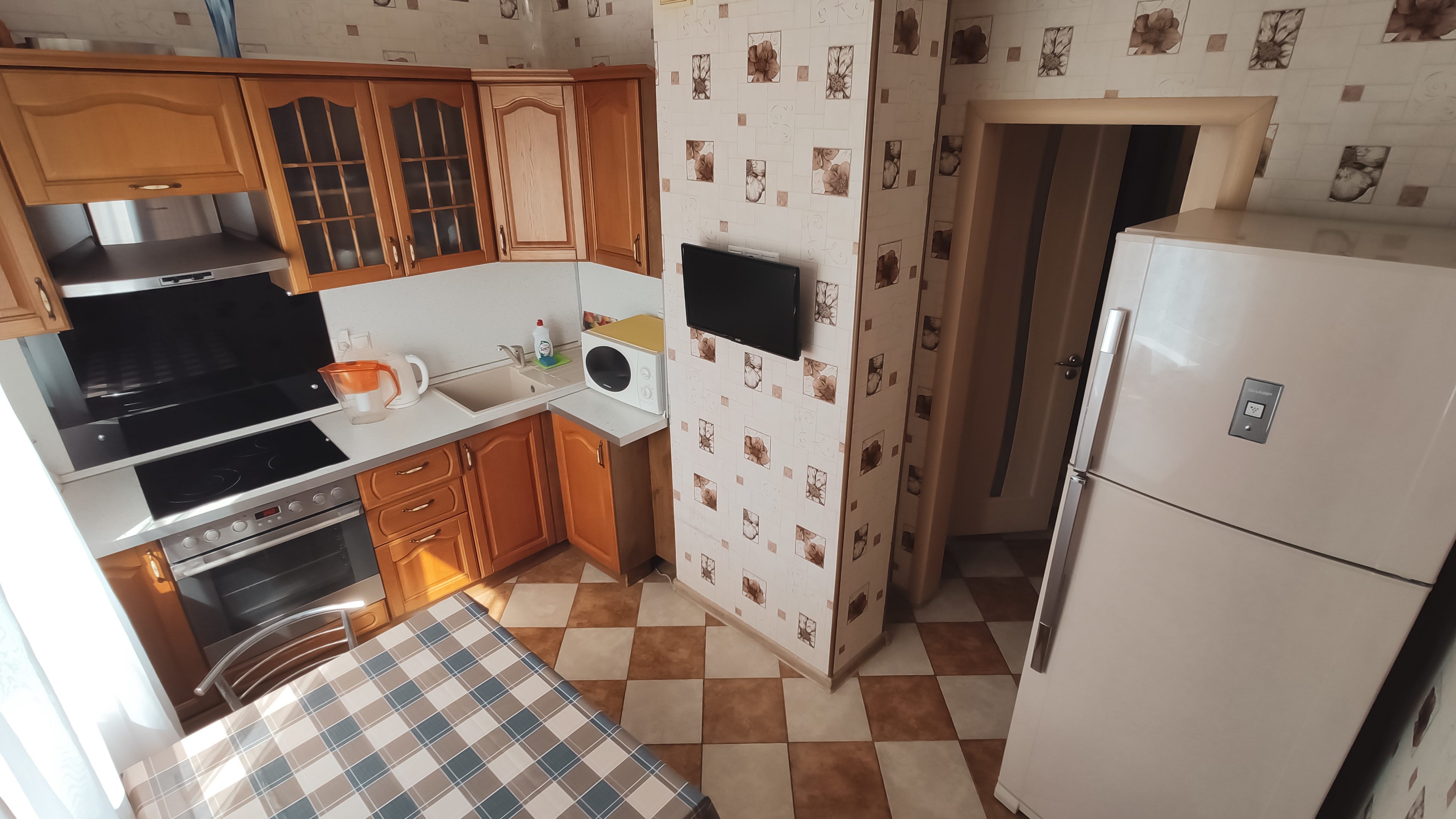 Кухня оснащена электроплитой, духовкой, вместительным холодильником, СВЧ-печью, чайником, посудой и всеми кухонными приборами.