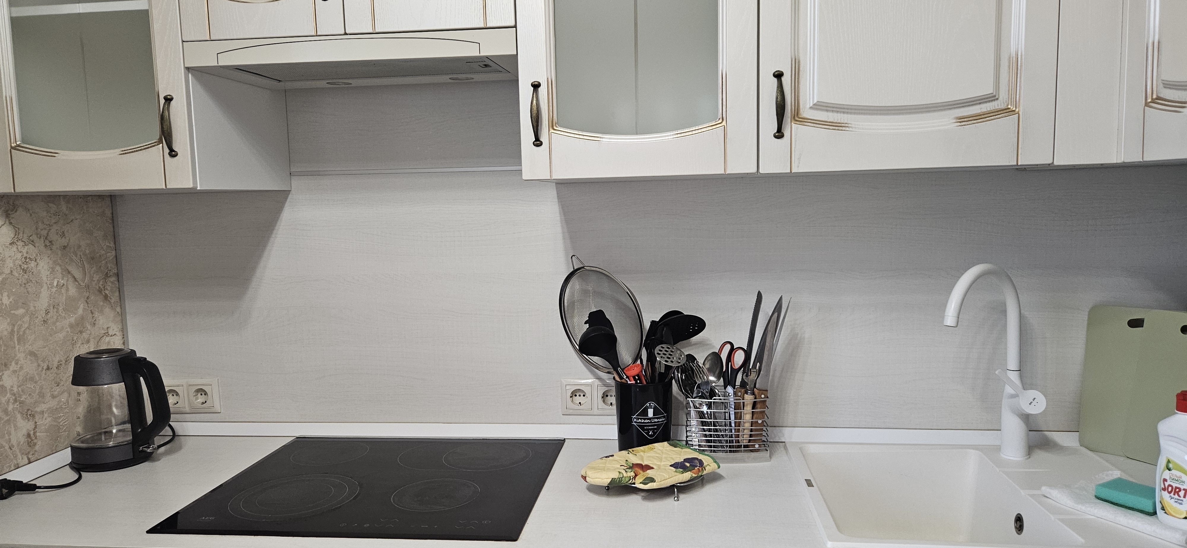 Кухня: плита, микроволновка, чайник, холодильник, вытяжка, набор посуды и все необходимые принадлежности для приема пищи, посуда для приготовления пищи, чай, соль, сахар, моющие для посуды и новая губка.
