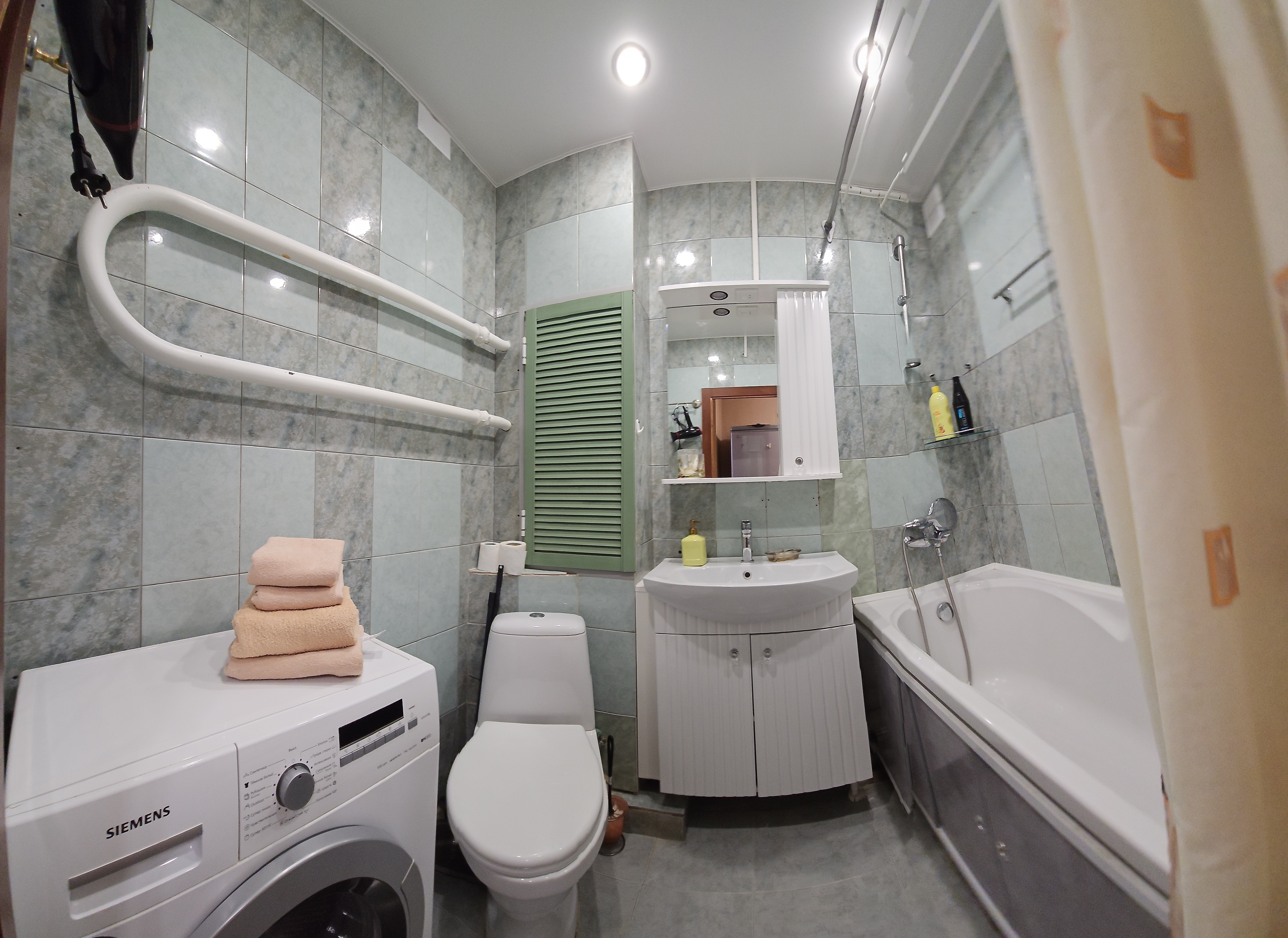 Ванная комната: ванна, стиральная машина, фен, сушилка, средства гигиены: мыло, шампунь, гель для душа, полотенца.