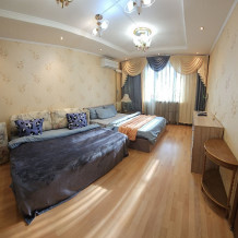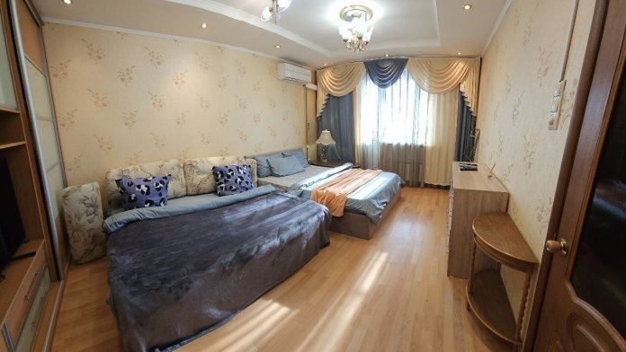 В квартире есть все необходимое для проживания четырех человек: двуспальный диван-кровать, двуспальная кровать, кондиционер, утюг, шторы, для Вашего комфортного отдыха, Wi-Fi, телевидение, шкаф для хранения вещей, свежее постельное белье, мягкие полотенца и набор косметики.