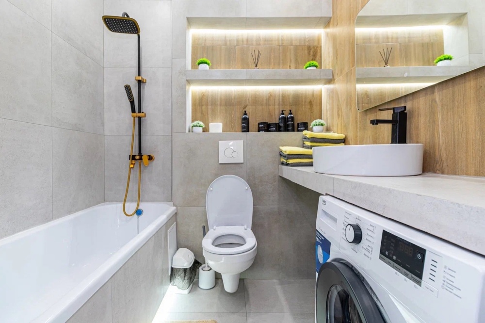 Современная ванная комната с эксклюзивными косметическими принадлежностями.