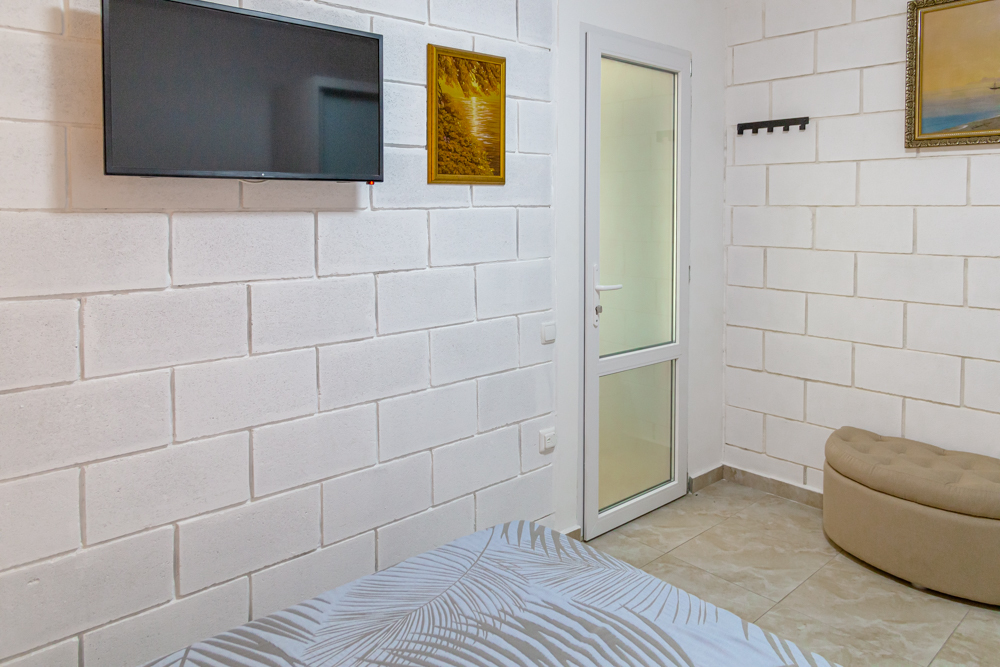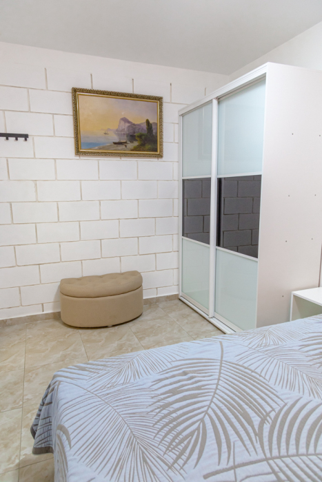 Уютные двухкомнатные апартаменты оснащены всем необходимым для комфортного отдыха: две двухспальные кровати, диван, два кондиционера, два телевизора, два шкафа и комод. Кухня полностью оборудована набором посуды и кастрюль. Предоставляем постельное белье и полотенца.