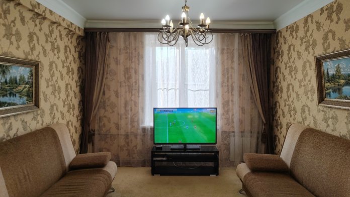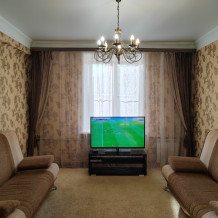 Большая двухкомнатная квартира с высокими потолками (классическая «сталинка»), с раздельными комнатами ( 18 и 15 м), длинным коридором 13 м, просторной кухней 10 м, евроремонтом, мебелью, техникой, большими телевизорами, СВЧ печью, эл. чайником, пылесосом, утюгом, гладильными принадлежностями, постельным бельём, всей необходимой посудой, феном, интернетом.