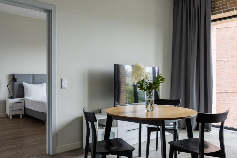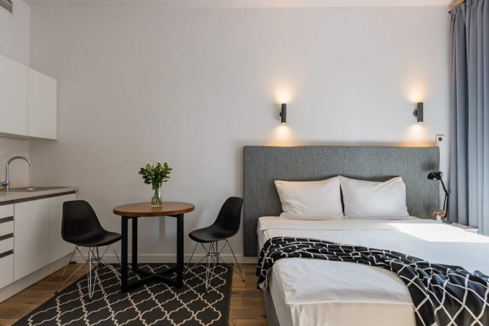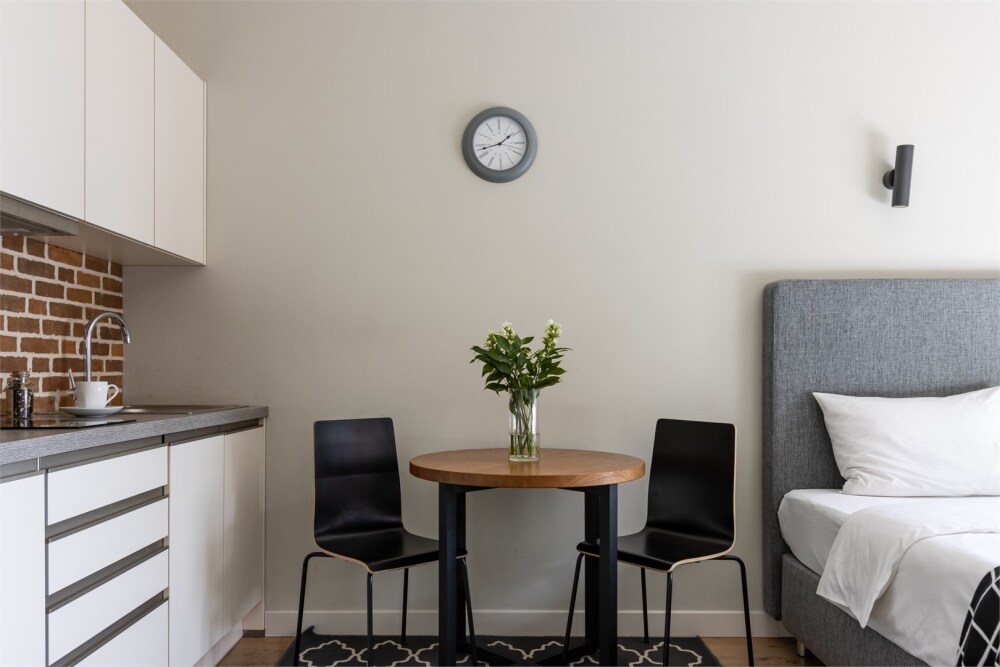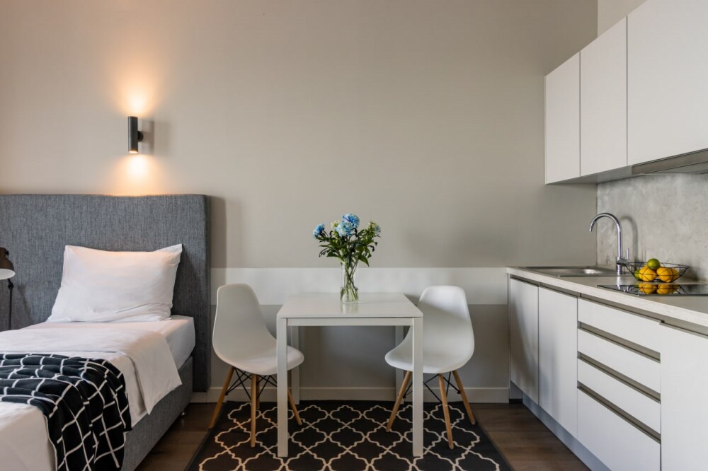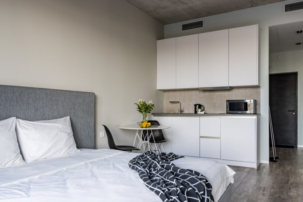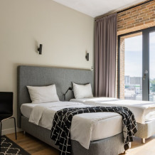 Номер подойдет компании друзей или семейной паре с детьми, а также коллегам, приехавшим в командировку. Два гостя могут разместиться в спальне; кухня-гостиная с дополнительным спальным местом рассчитана на двух взрослых или двоих детей.