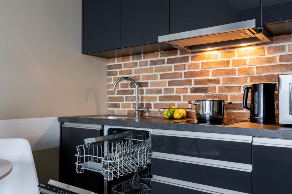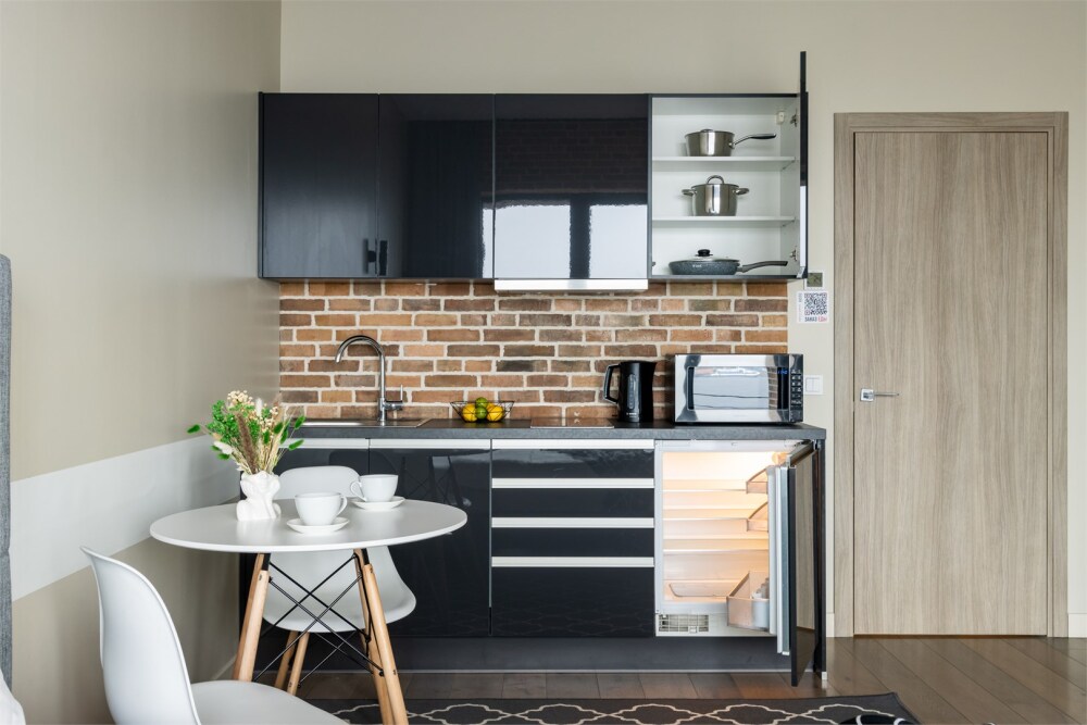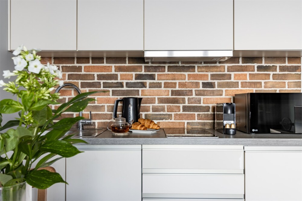 Высокие потолки, отделка стен клинкерным кирпичом, безупречная шумоизоляция. Кухня оборудована техникой для приготовления еды и сохранения продуктов, оснащена посудой и столовыми приборами.